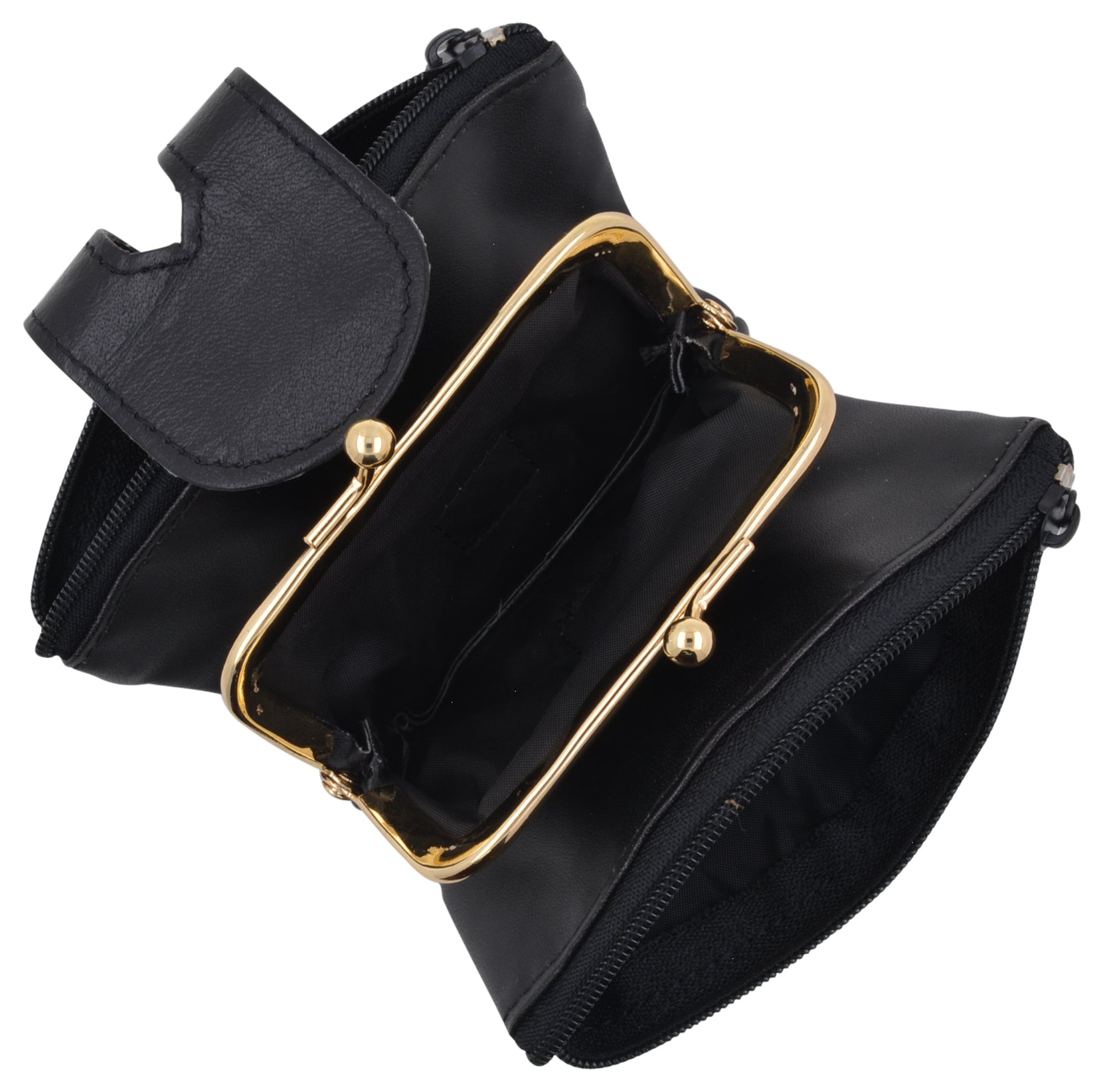 Large main compartment for money, keys, receipts, lipstick, etc. Inside change purse with snap closure....