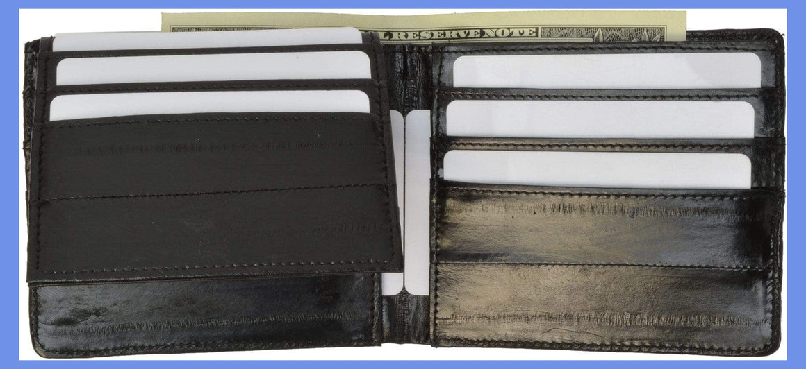Material: Genuine Eel Skin Size: 4"; x 7"; (Folded) approx Credit Card Slots: 6+ I.D....