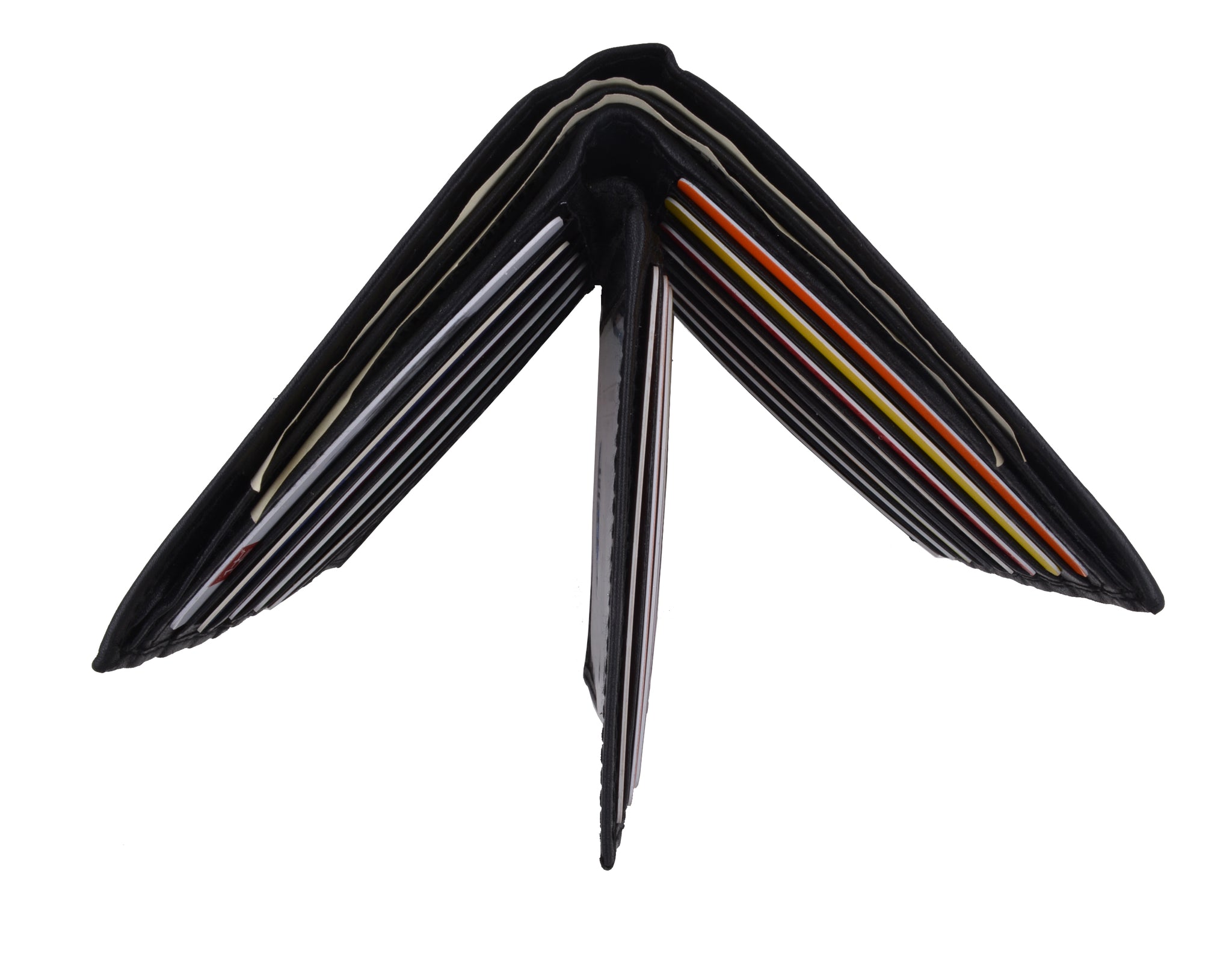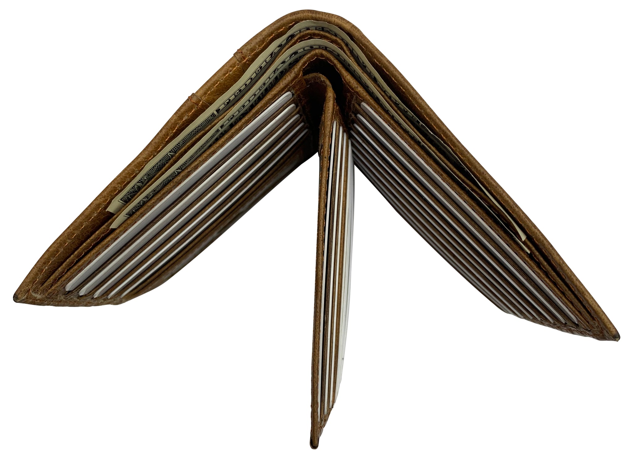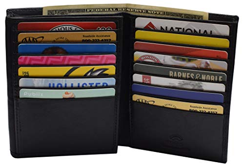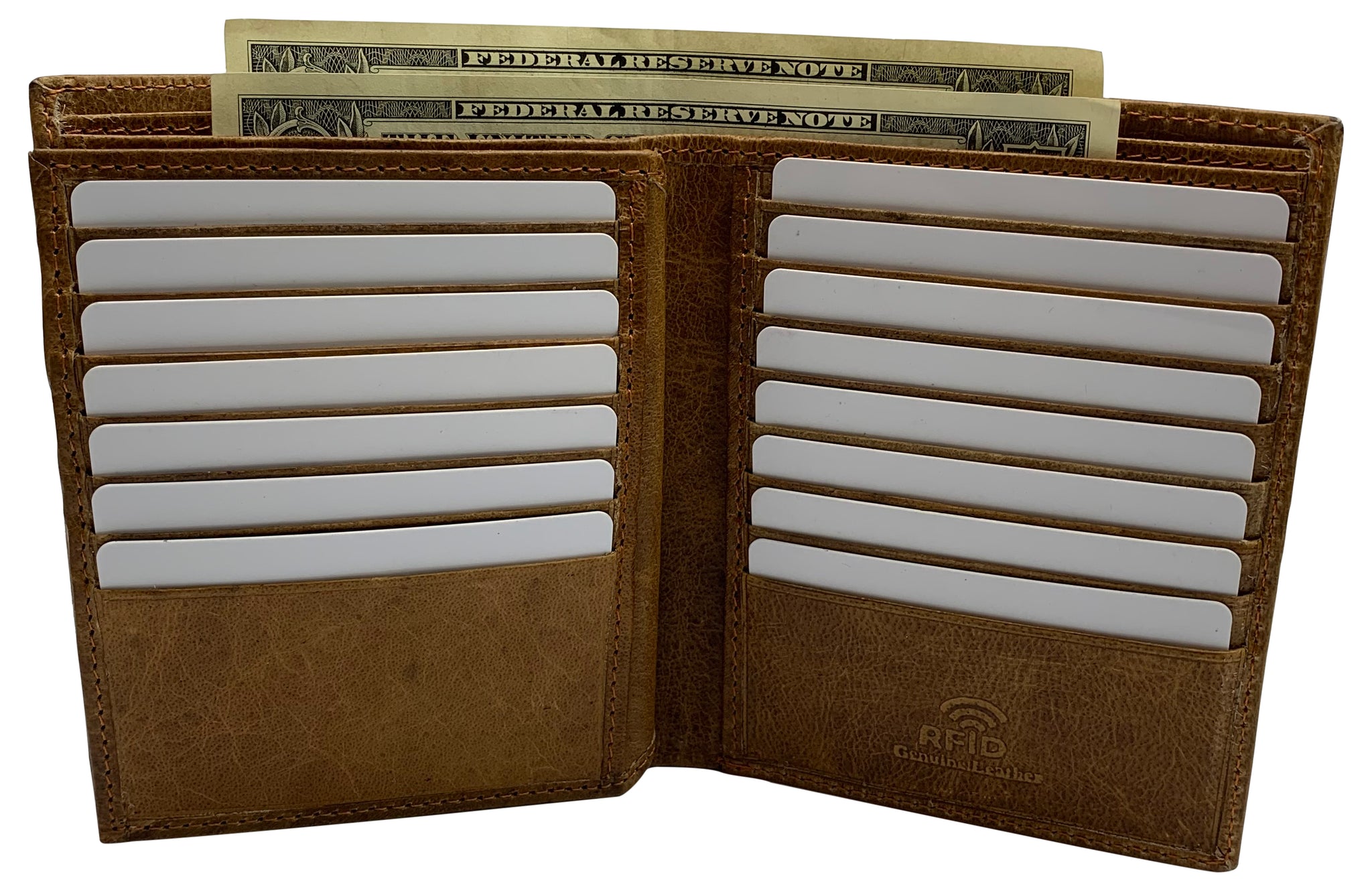 Material: Genuine Leather Bi-foldCredit Card Slots: 12+I.D. Window: YesCurrency Pocket: Two separate dividersOther features: Slim...