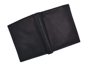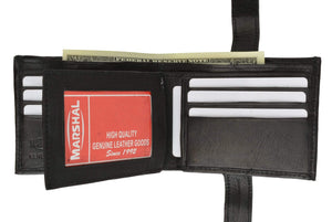 Material: Genuine Leather Bi-fold6+ Credit Card slotsID Window: YesOther features:Leather strap with Tape to keep...