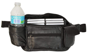 Material: Genuine LeatherSize: 12" x 5.5" approx Four zippered pockets Adjustable waist strap