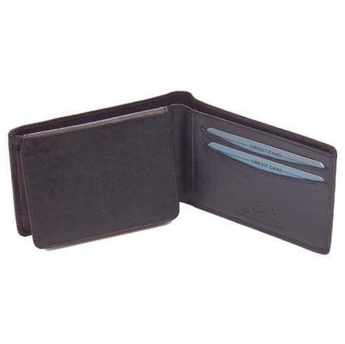 Material: Genuine Leather Bi-fold Size: 4.25"; x 3.25"; Credit Card Slots: 2+ I.D. Window: Yes...