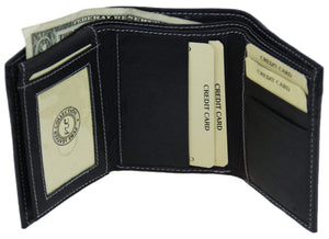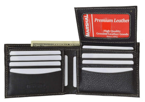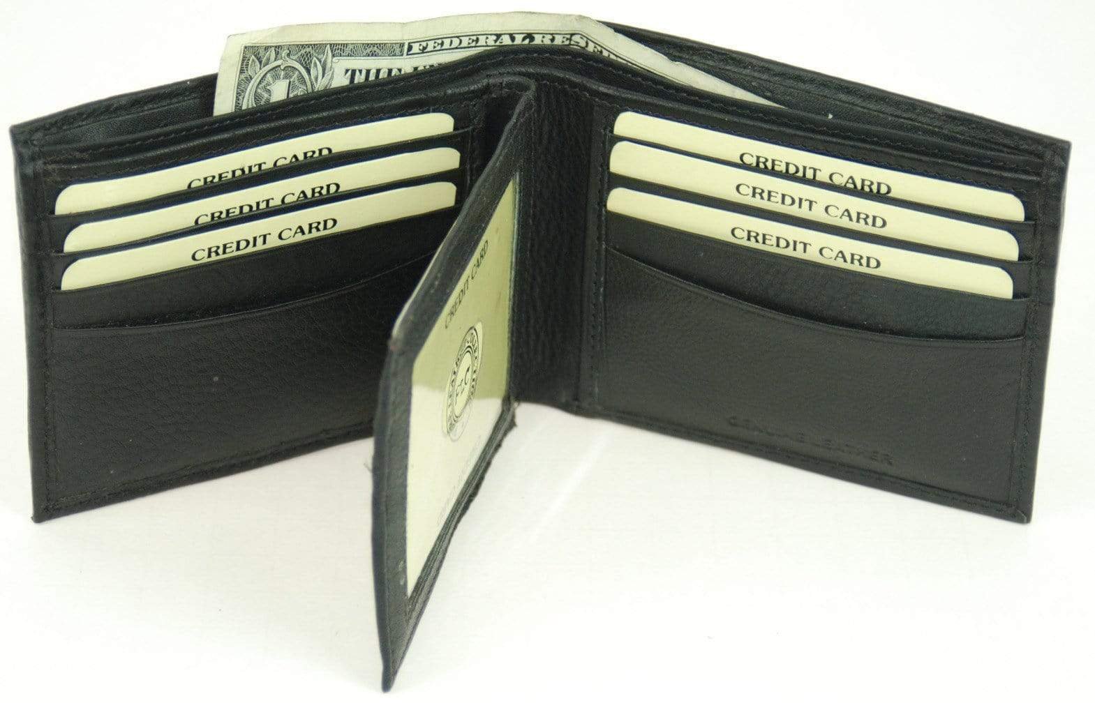 Material: Genuine Leather Bi-fold Size: 7.5" x 4.5" Credit Card Slots: 8+ I.D. Window: Yes...