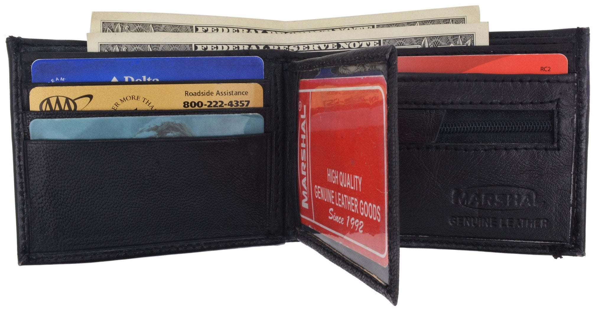 Material: Genuine Leather Bi-foldCredit Card Slots: 9+I.D. Window: Yes (Flip-Up)Currency Pocket: Divider; Hideaway Zippered PocketOther...