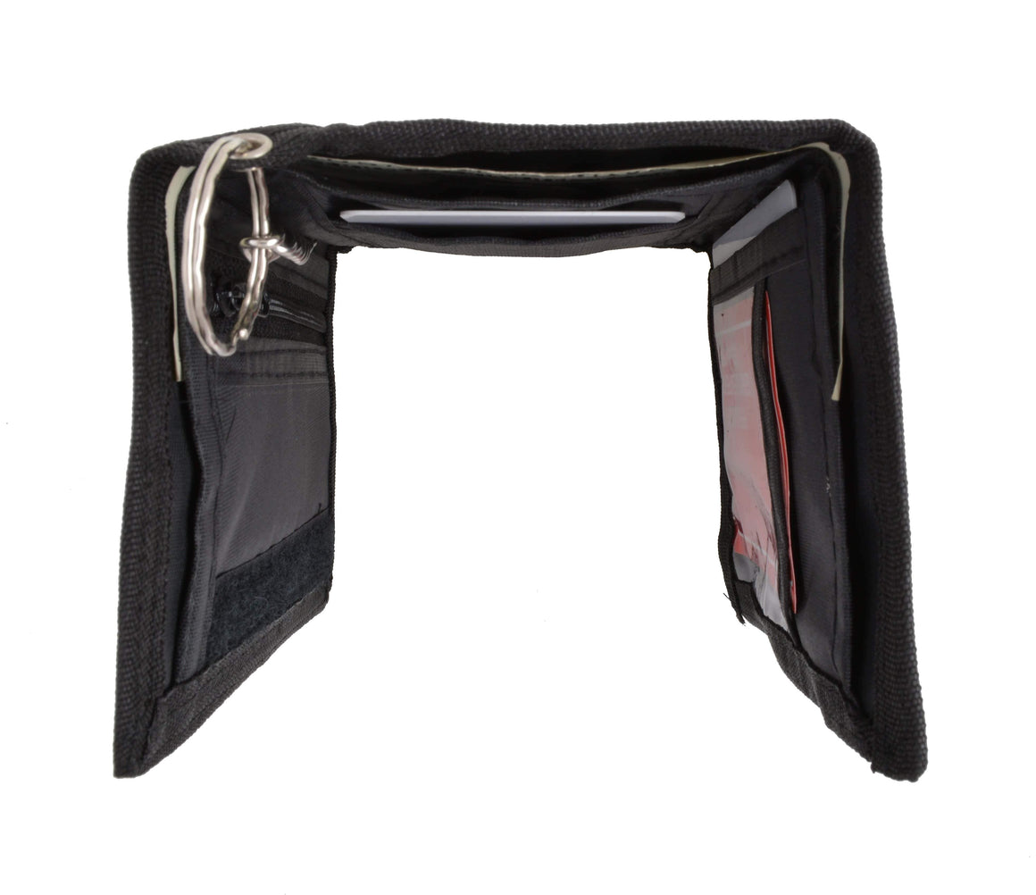 Nylon Tri-Fold Wallet with Tape Closure2 Zippered Coin CompartmentsID Window4 Credit Card SlotsOne Large Bill CompartmentMeasurements:...