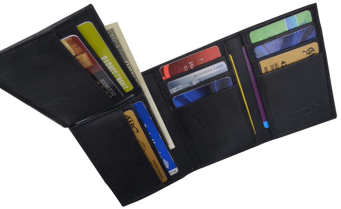 Material: Genuine Leather Tri-foldCredit Card Slots: 9+I.D. Window: Yes (2; Internal; 1 Flip-up)Currency Pocket: DividerOther...