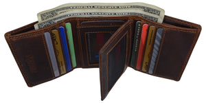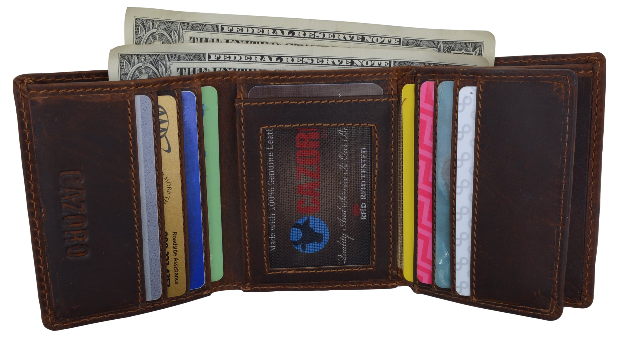 Brand: Cazoro Details: Genuine Cow Vintage Brown Leather with R.F.I.D ( Radio Frequency Identification Blockers ) Trifold wallet...