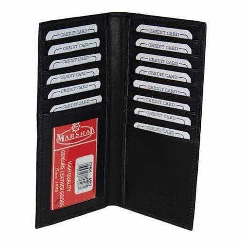 Material: Genuine Leather Bi-fold Size: 6" x 5.5" Credit Card Slots: 18+ I.D. Window: External...