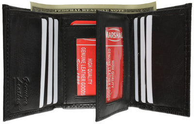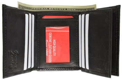 Material: Genuine Leather Tri-fold Credit Card Slots: 8+ I.D. Window: Yes Currency Pocket: Divider; Hideaway...