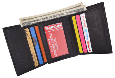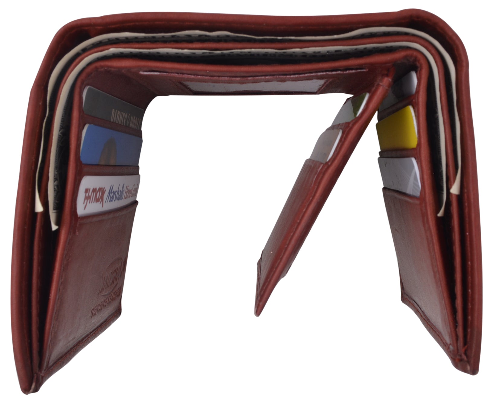 Material: Genuine Leather Tri-fold Credit Card Slots: 8+ I.D. Window: Yes Currency Pocket: Divider; Hideaway...
