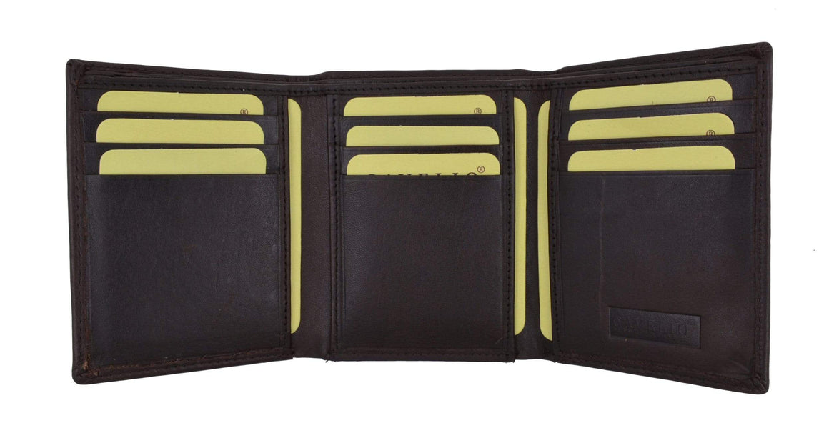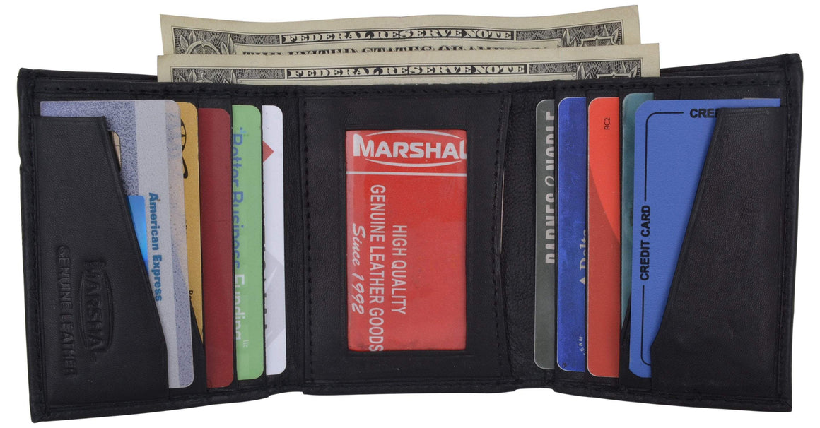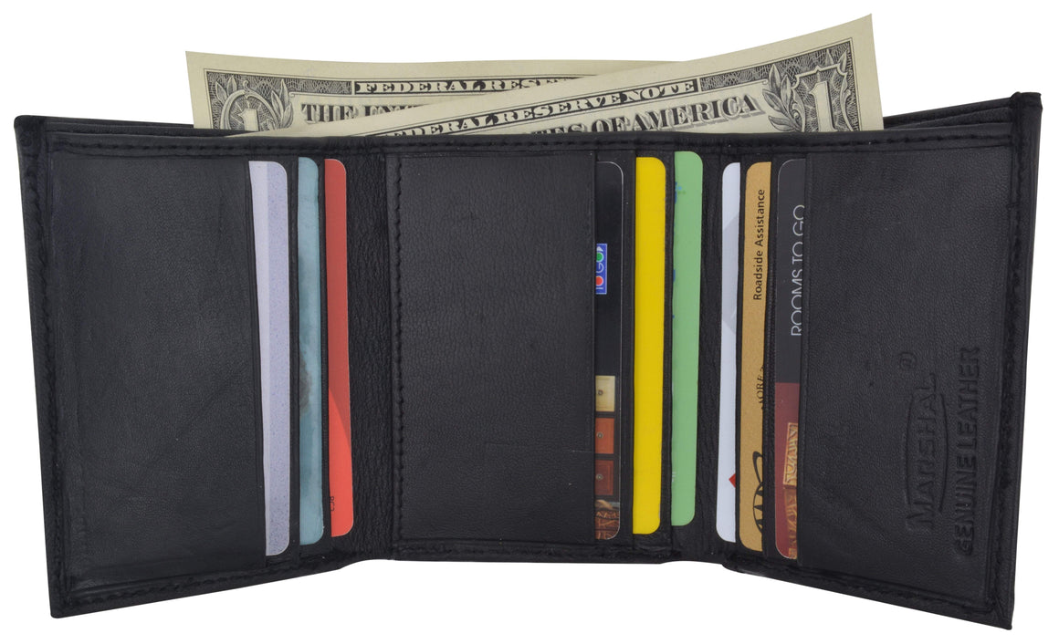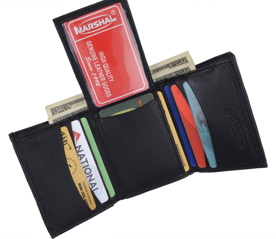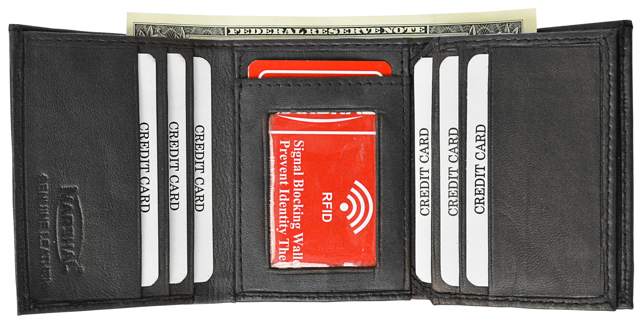 Material: Genuine Leather Tri-foldCredit Card Slots: 9+I.D. Window: Yes (2; Internal & Flip-up)Currency Pocket: Divider;...