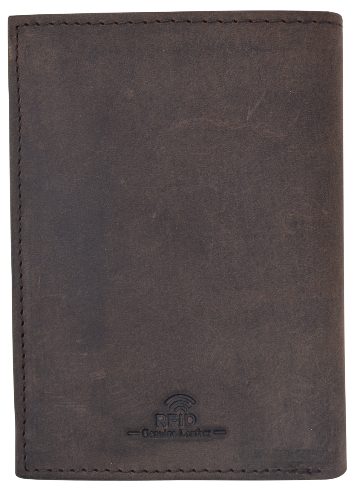Material: Genuine Leather Tri-foldCredit Card Slots: 10+I.D. Window: YesCurrency Pocket: Divider; Hideaway zippered pocketVertical Card...
