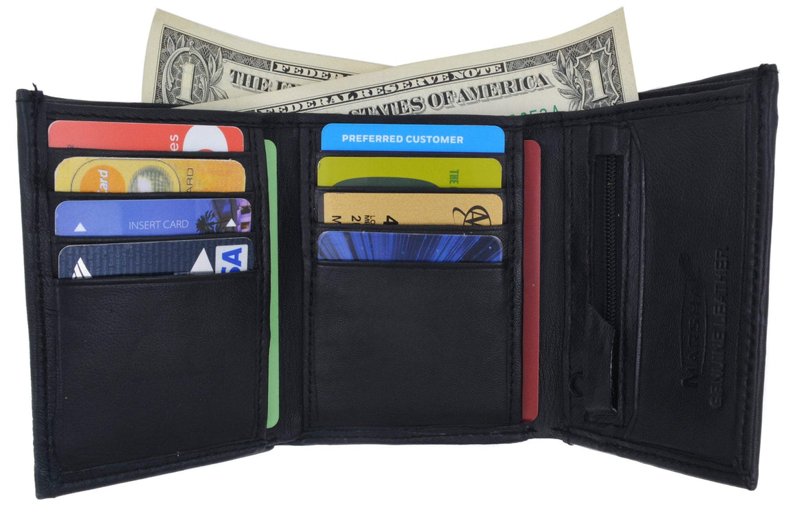 Genuine Leather Trifold Wallet 2 Currency Compartments and a bill length zip pocket inside the...