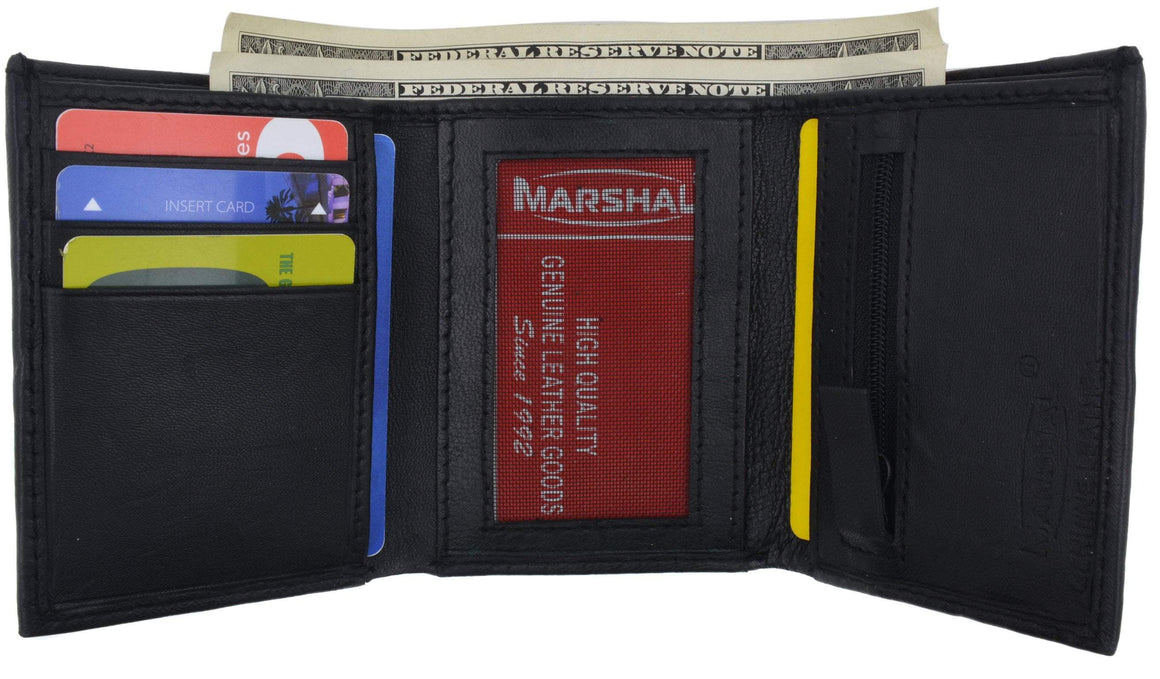Material: Genuine Leather Tri-fold Credit Card Slots: 8+ I.D. Window: Yes Currency Pocket: Divider; Hideaway...