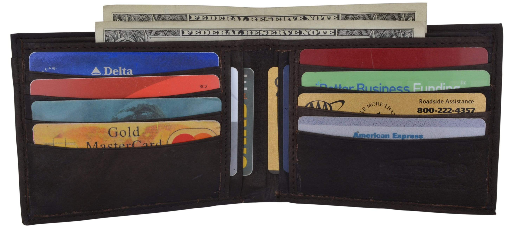 Material: Genuine Leather Bi-foldCredit Card Slots: 8+I.D. Window: 2 (Internal; Flip-up)Currency Pocket: 2 Bill Pockets;...