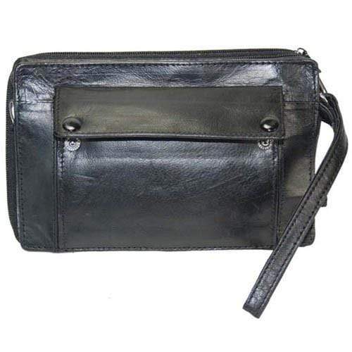 Material: Genuine LeatherSize: 6"; x 8.5" approxOther features: Four zippered pockets; One open pocket; Cell...
