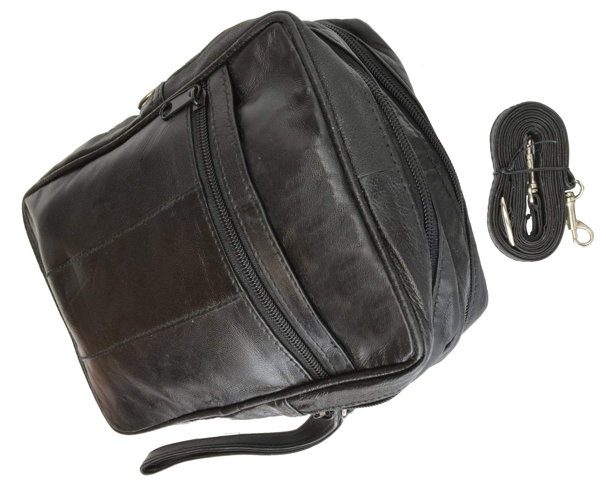 Material: Genuine LeatherSize: 4.5"; x 7" approxOther features: Two zippered pocketsAdjustable Strap