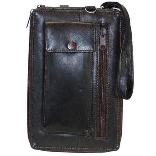 Material: Genuine LeatherSize: 5.5"; x 9" approxOther features: Four zippered pockets; Cell phone holder with...