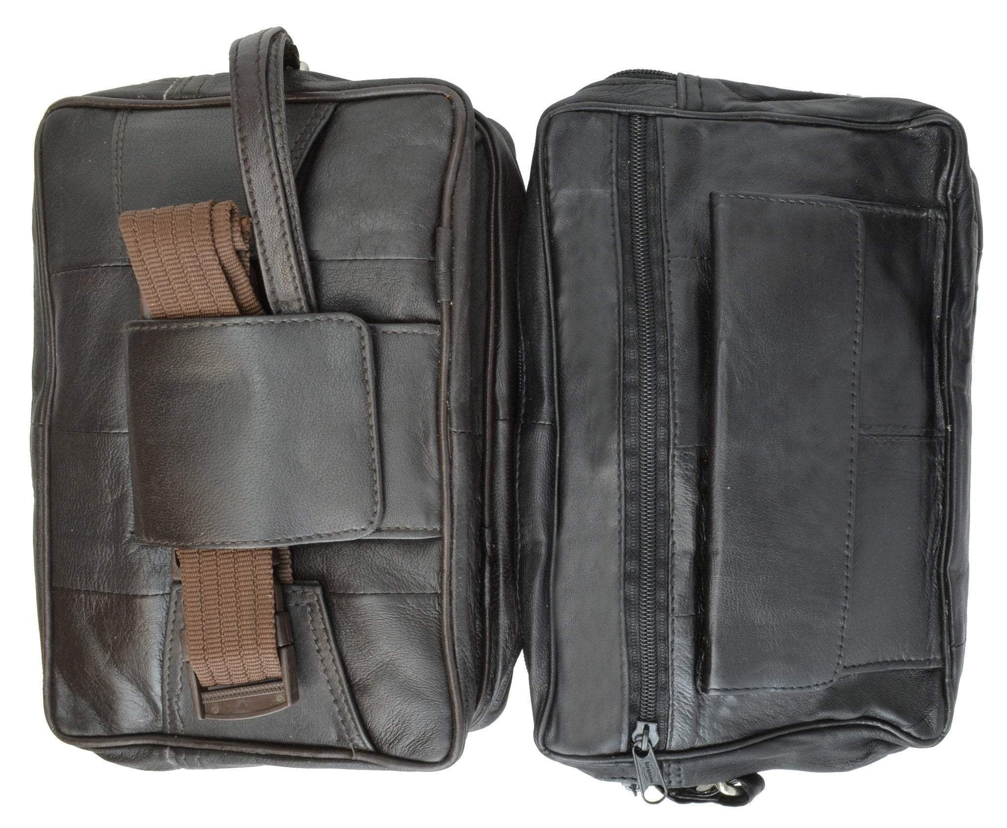 Material: Genuine LeatherSize: 5.5"; x 9" approxOther features: Four zippered pockets; Cell phone holder with...