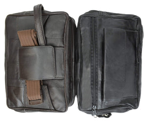 Material: Genuine LeatherSize: 6"; x 8.5" approxOther features: Four zippered pockets; One open pocket; Cell...