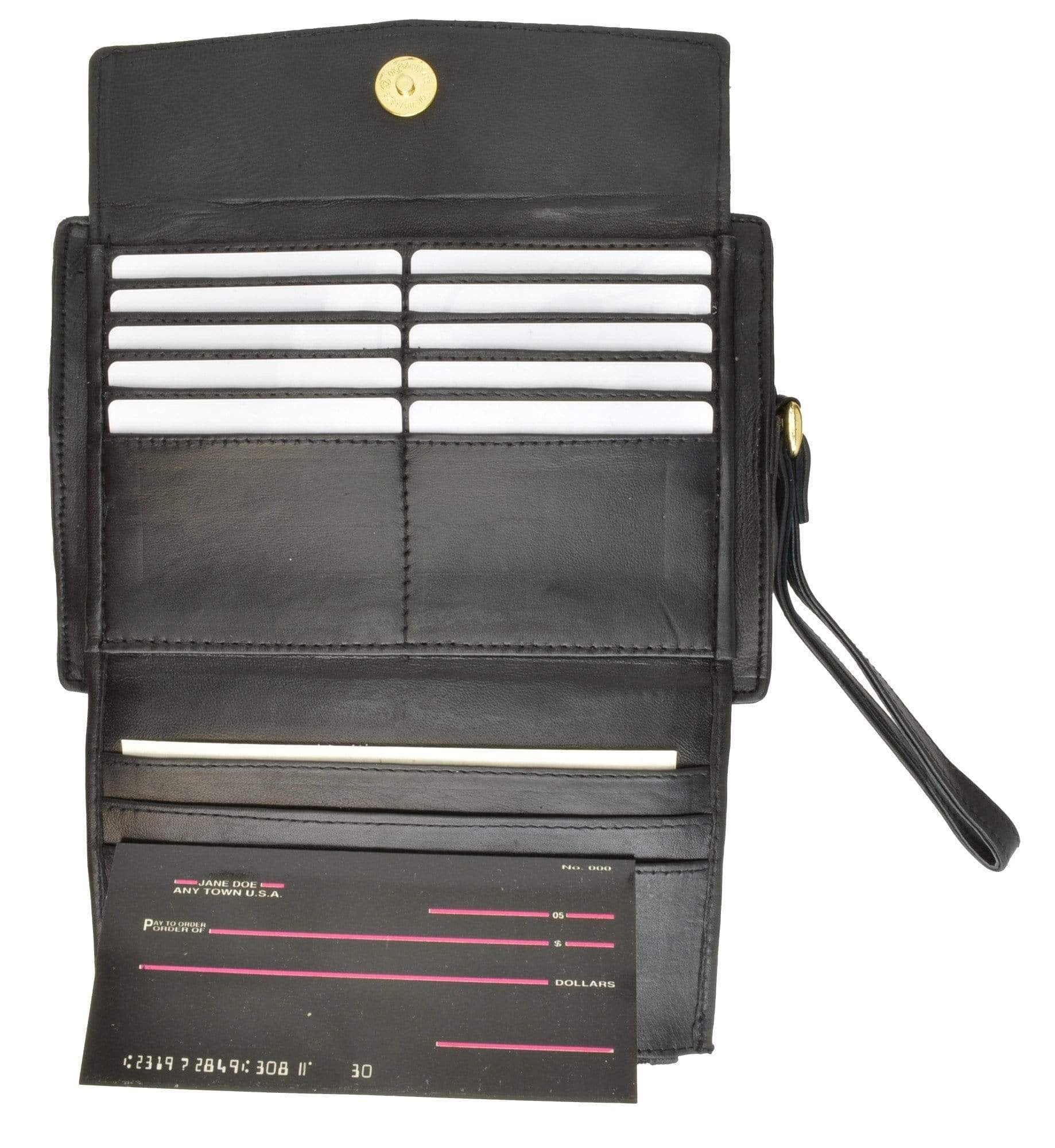 Material: Genuine LeatherMeasures: 8" X 5.5" approxRemovable strapCredit card slotsCheck book Zippered pockets