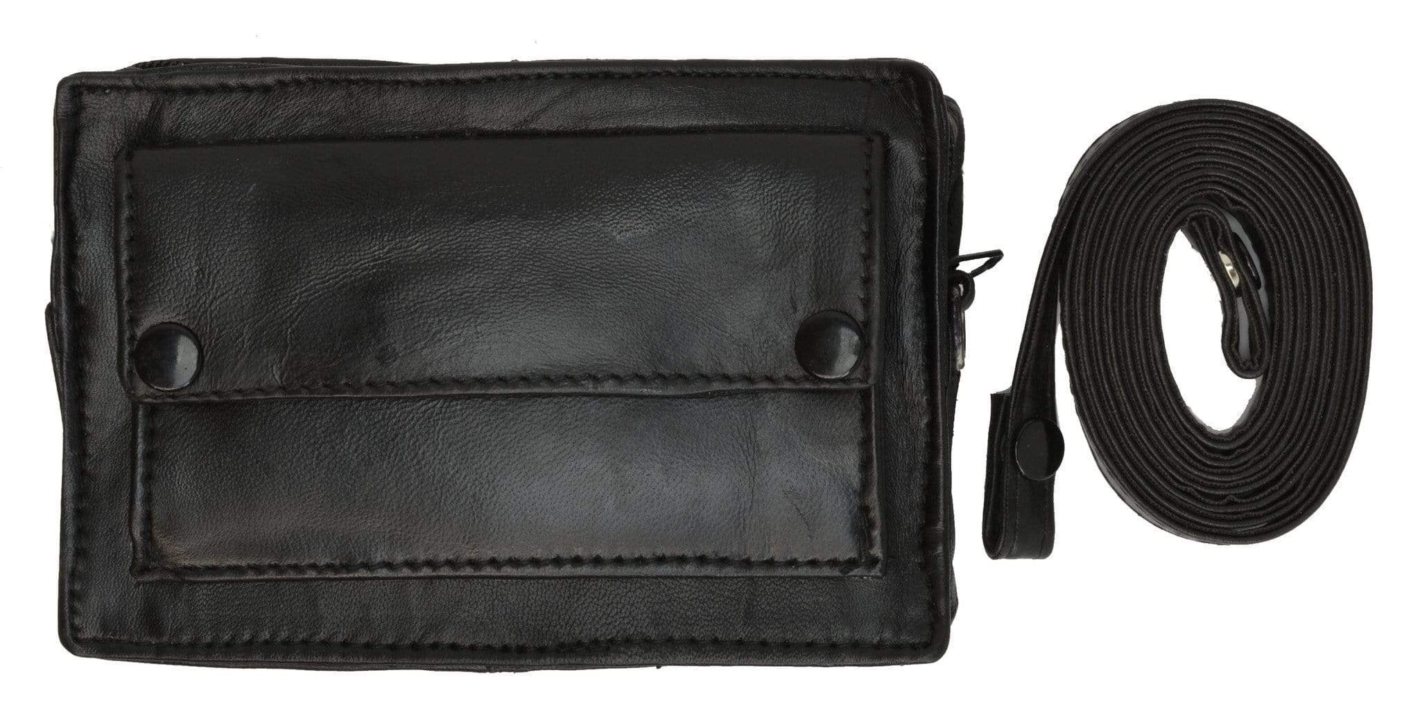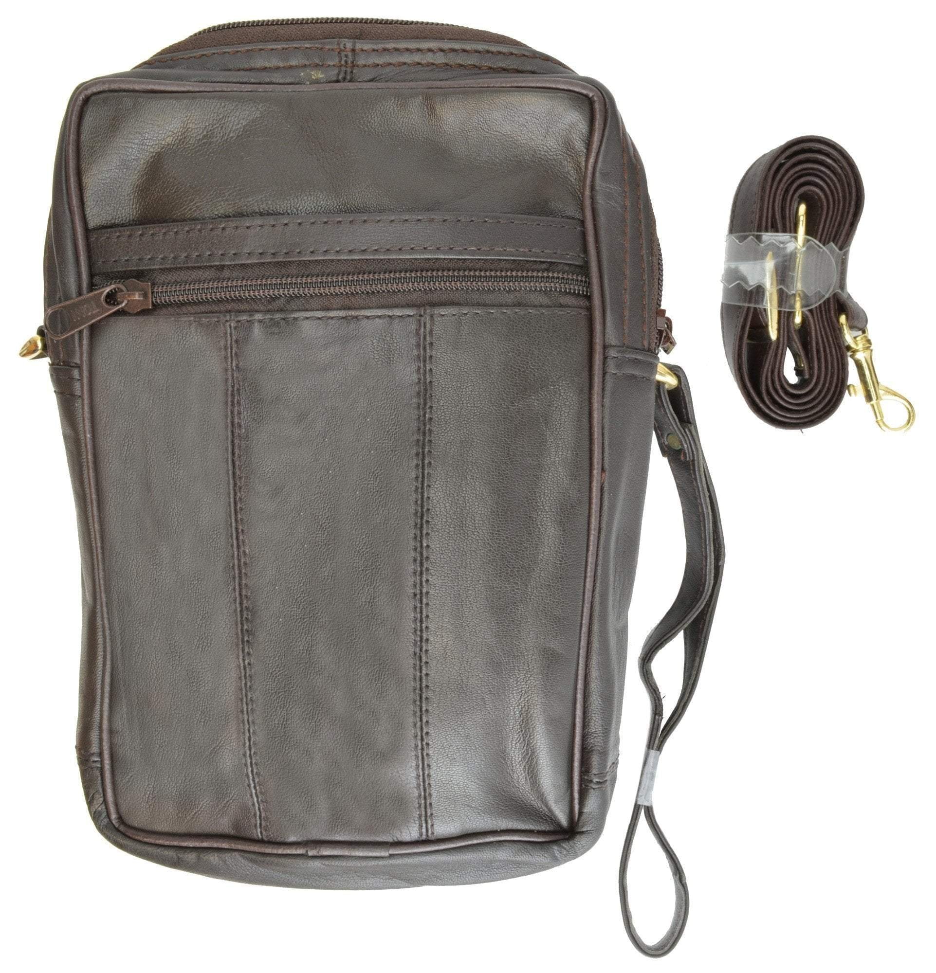 Material: Genuine LeatherSize: 4.5"; x 7" approxOther features: Two zippered pocketsAdjustable Strap