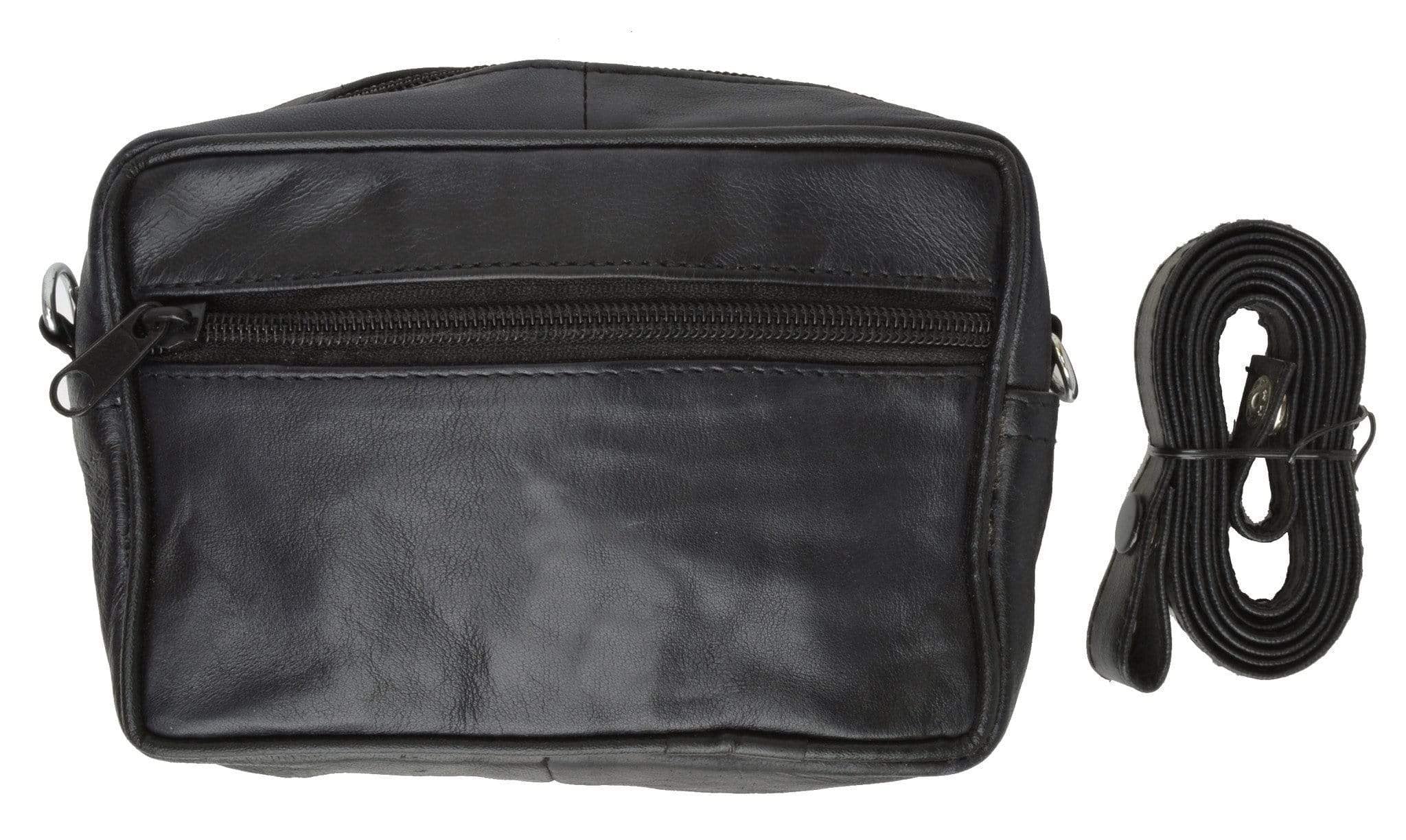 Material: Genuine LeatherSize: 4.5"; x 7" approxOther features: Two zippered pocketsAdjustable Strap