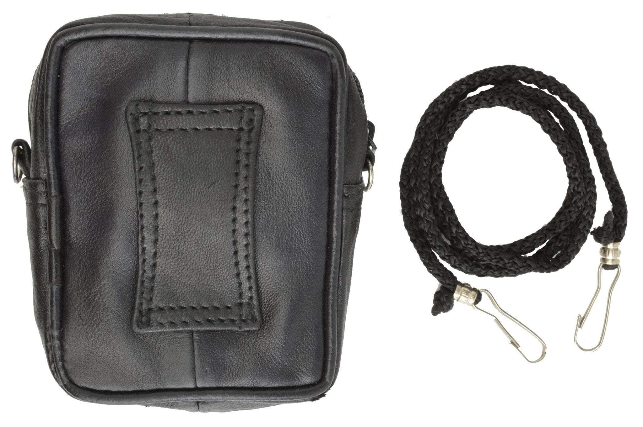 Material: Genuine LeatherSize: 4.5"; x 7" approxOther features: Two zippered pocketsAdjustable Strap