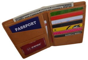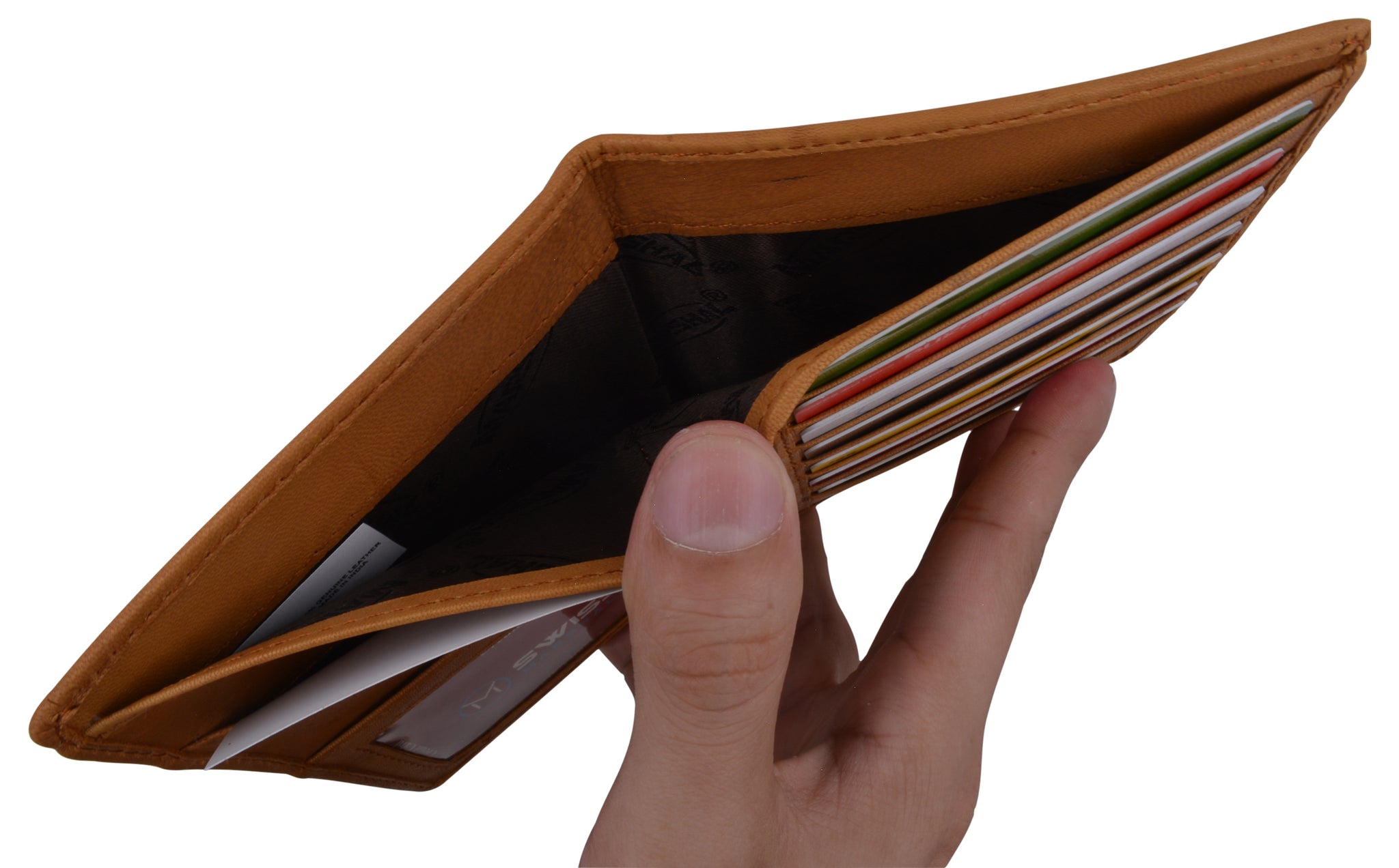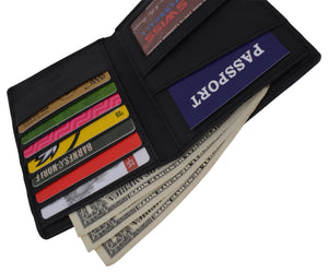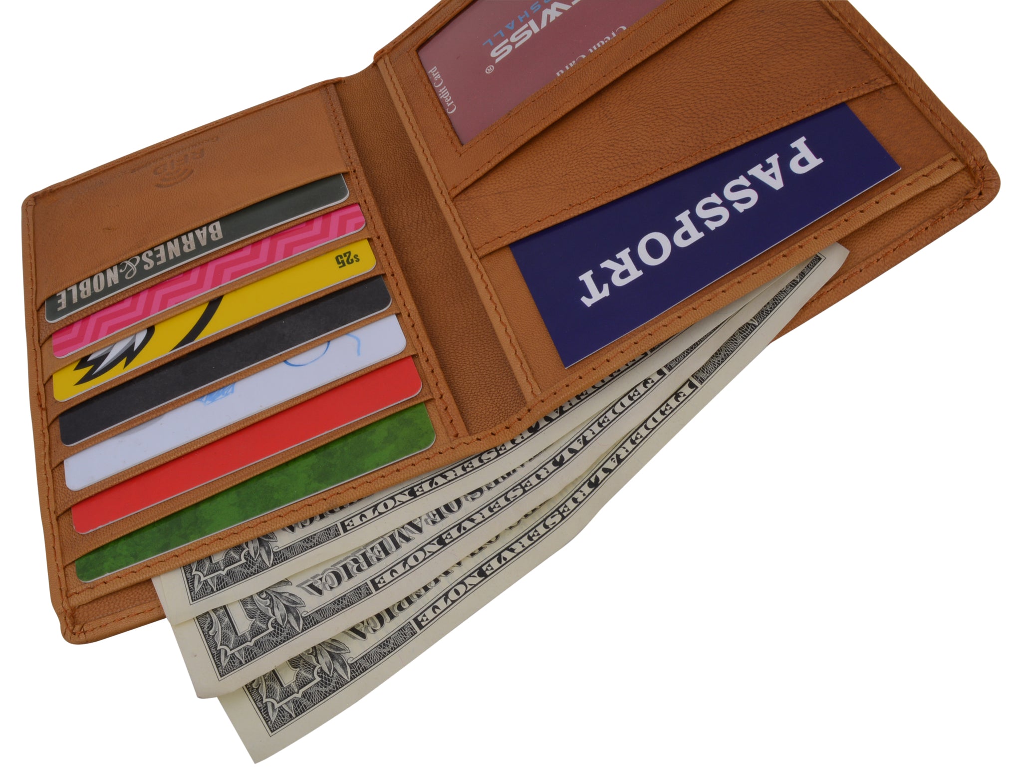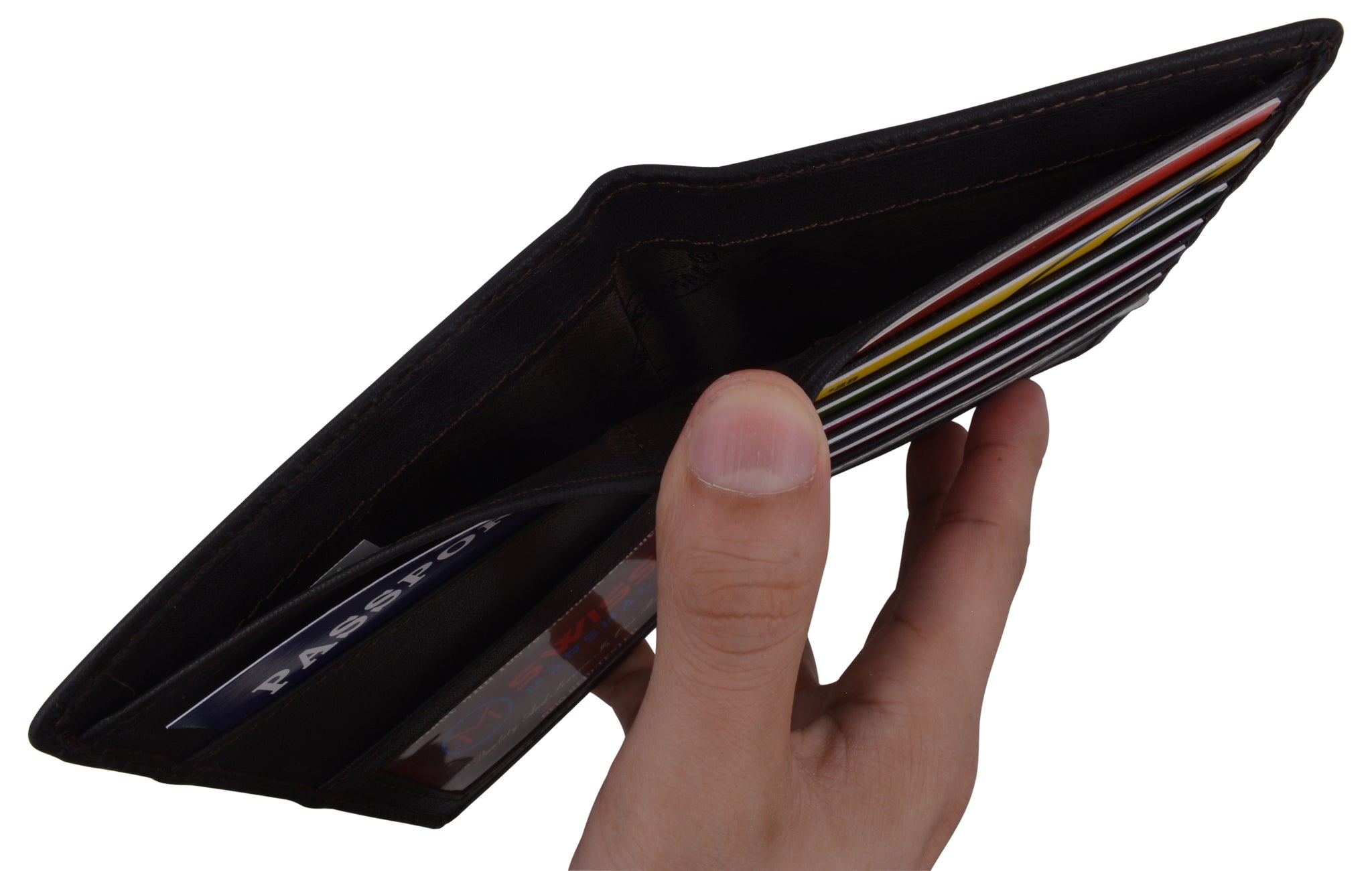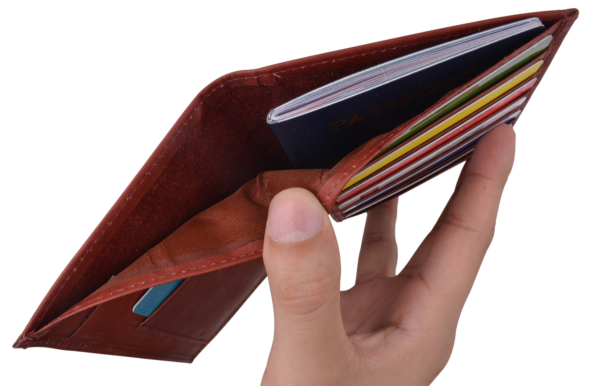 Material: Genuine LeatherSize: 9" x 4.75" (folded) approxCredit Card Slots: 3+Other features: A slot for passports;...