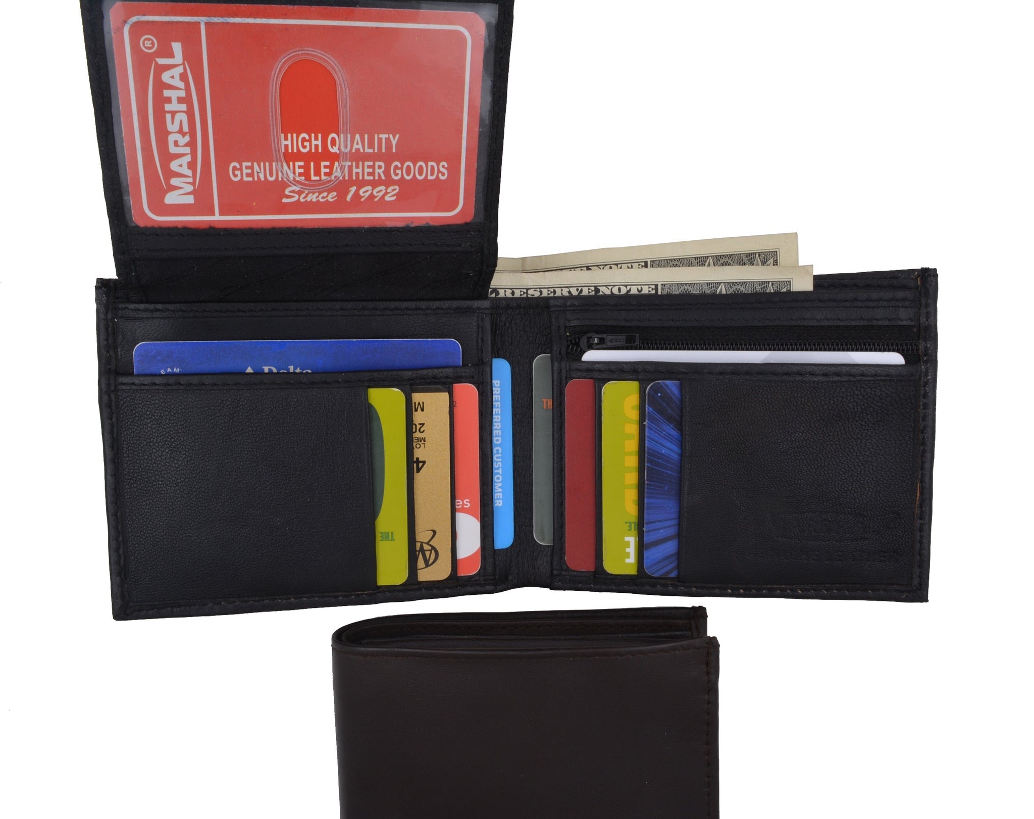 Material: Genuine Leather Tri-fold Credit Card Slots: 8+ I.D. Window: Yes Currency Pocket: Divider; Hideaway...