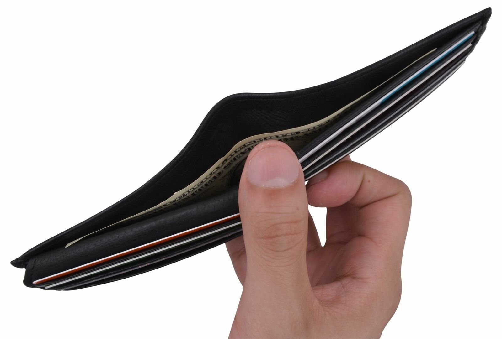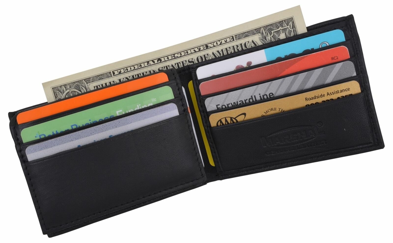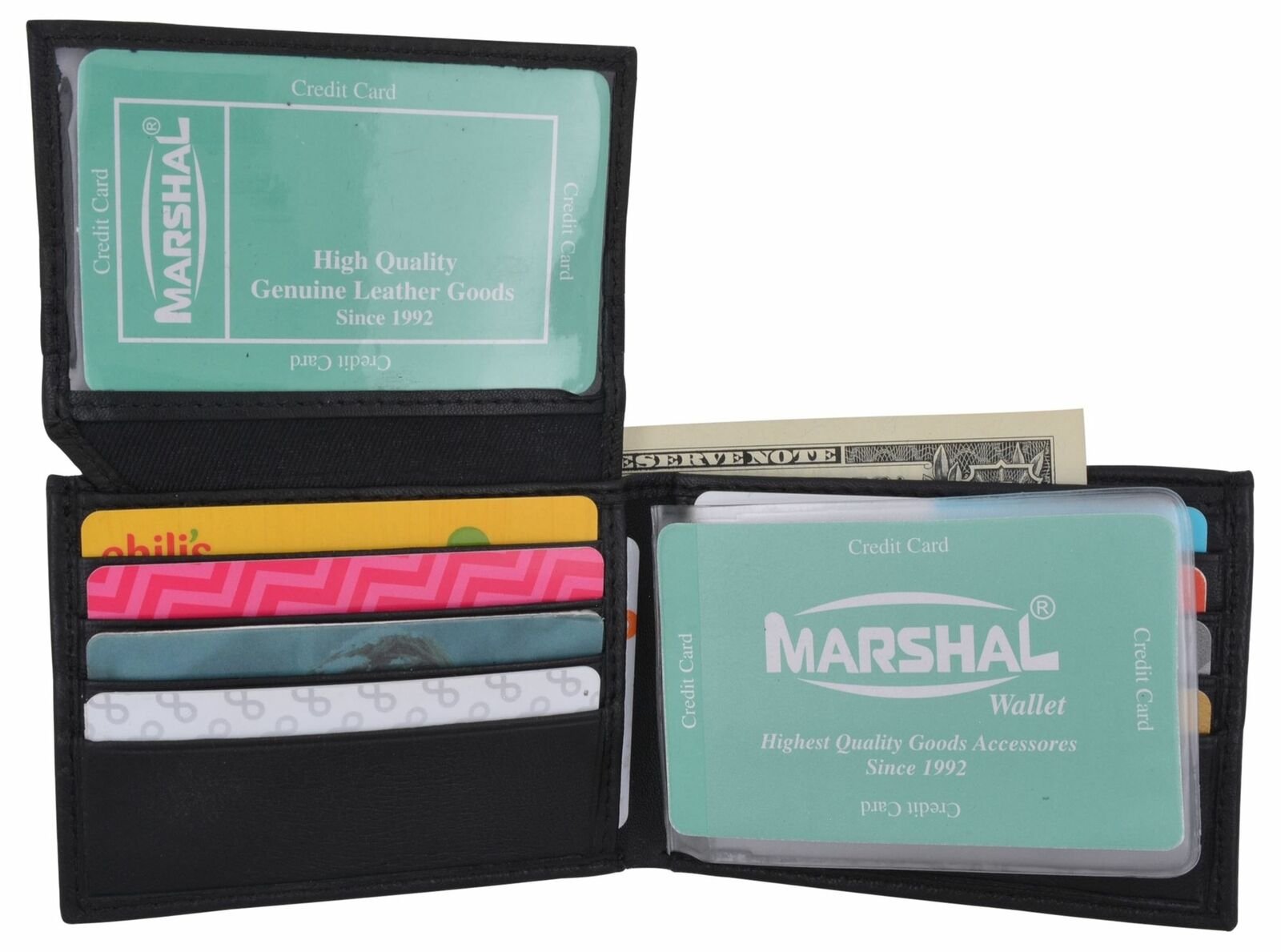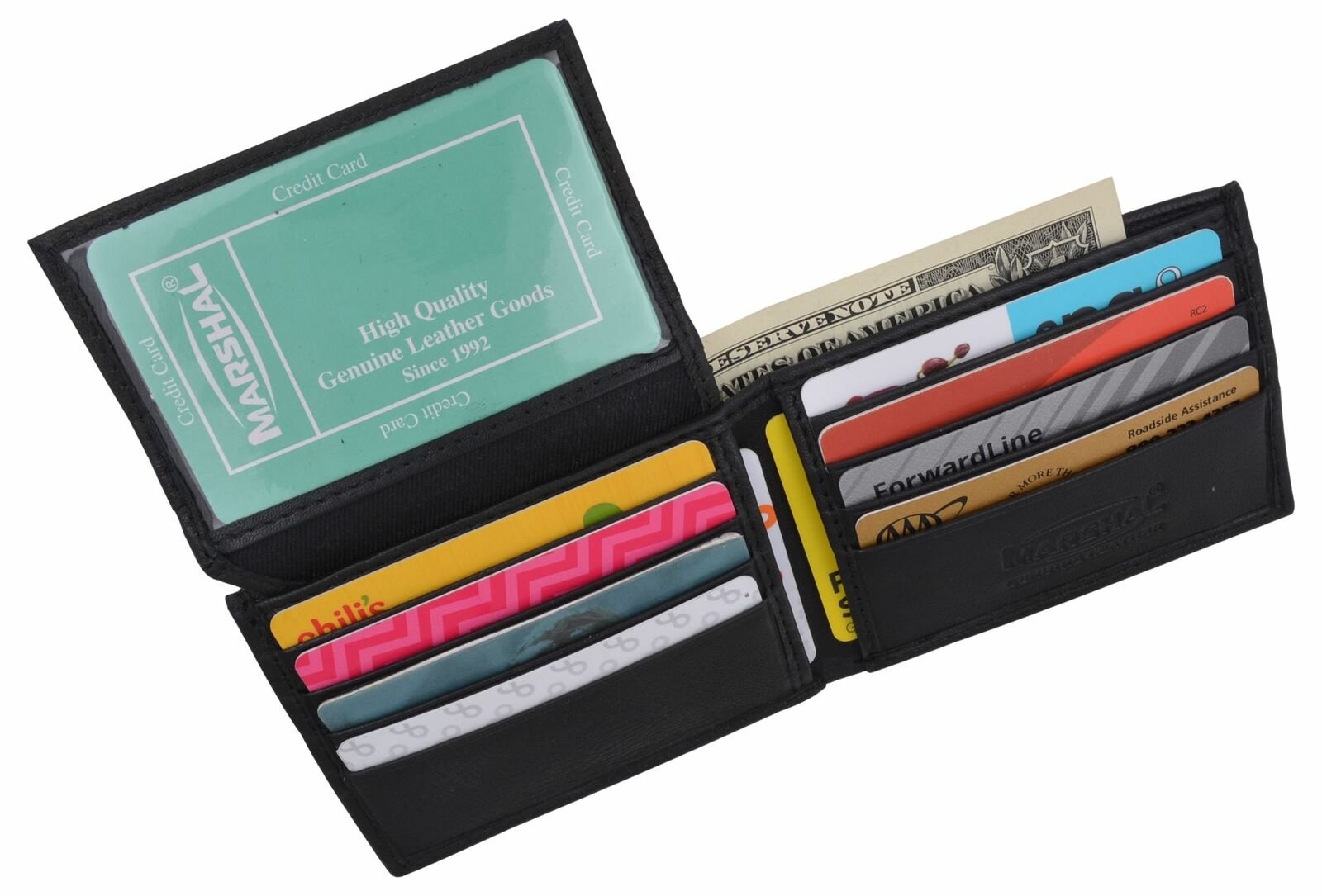 Material: Genuine Leather Tri-fold Credit Card Slots: 8+ I.D. Window: Yes Currency Pocket: Divider; Hideaway...