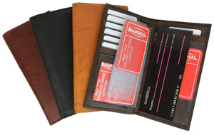 Material: Genuine Leather Bi-fold Size: 7.5" x 7" Credit Card Slots: 12+ I.D. Window: Yes Currency Pocket: Large pocket in back Other features: Removable plastic credit card holder; Area for check book; Two additional pockets on right side; Pocket under credit card slot; Zippered pocket; Pen holder