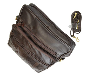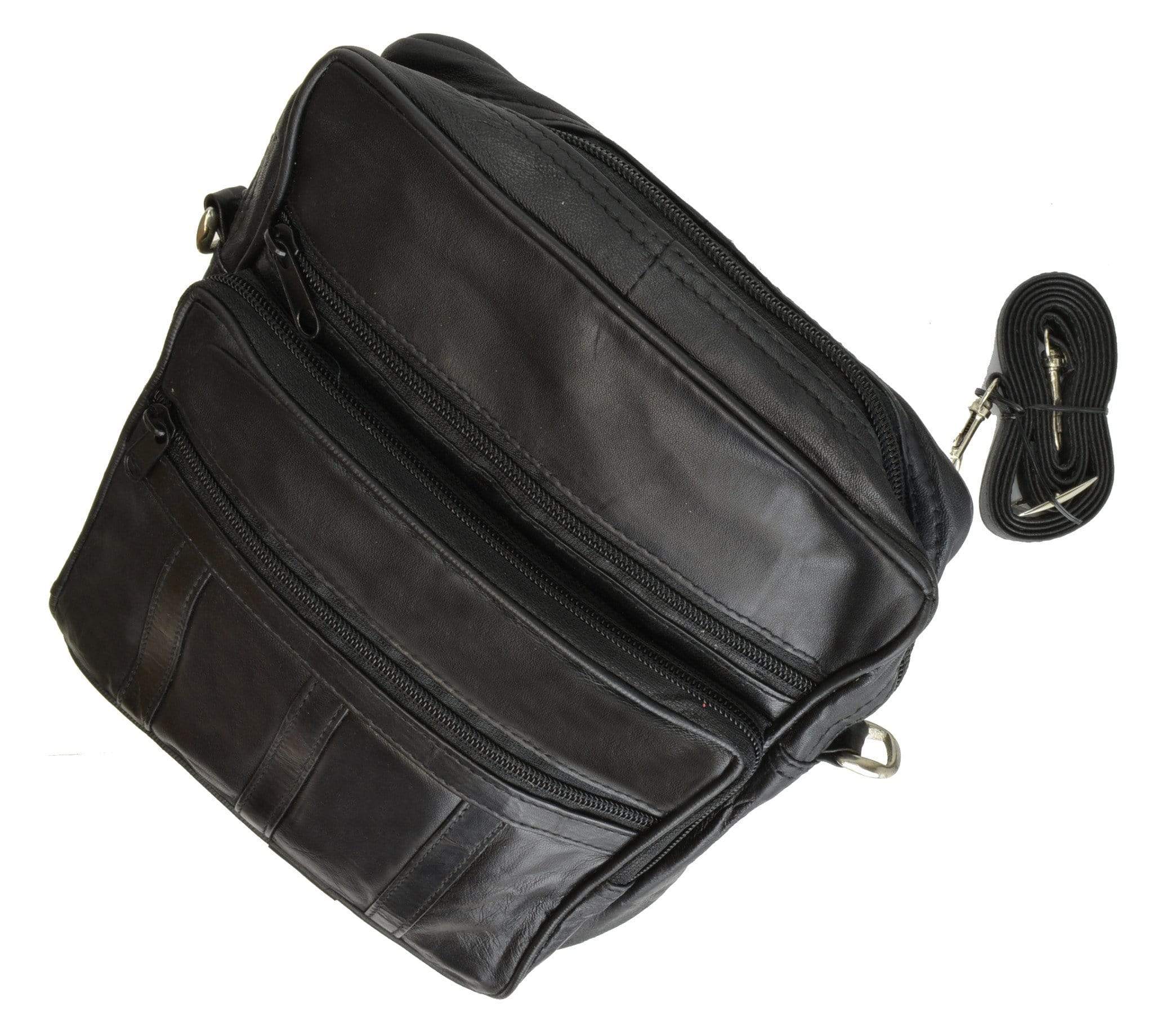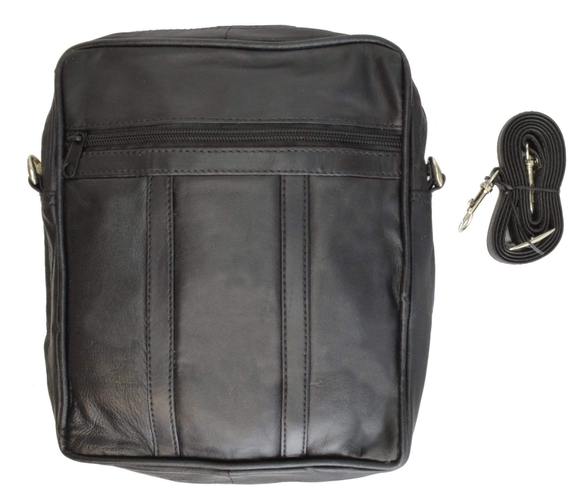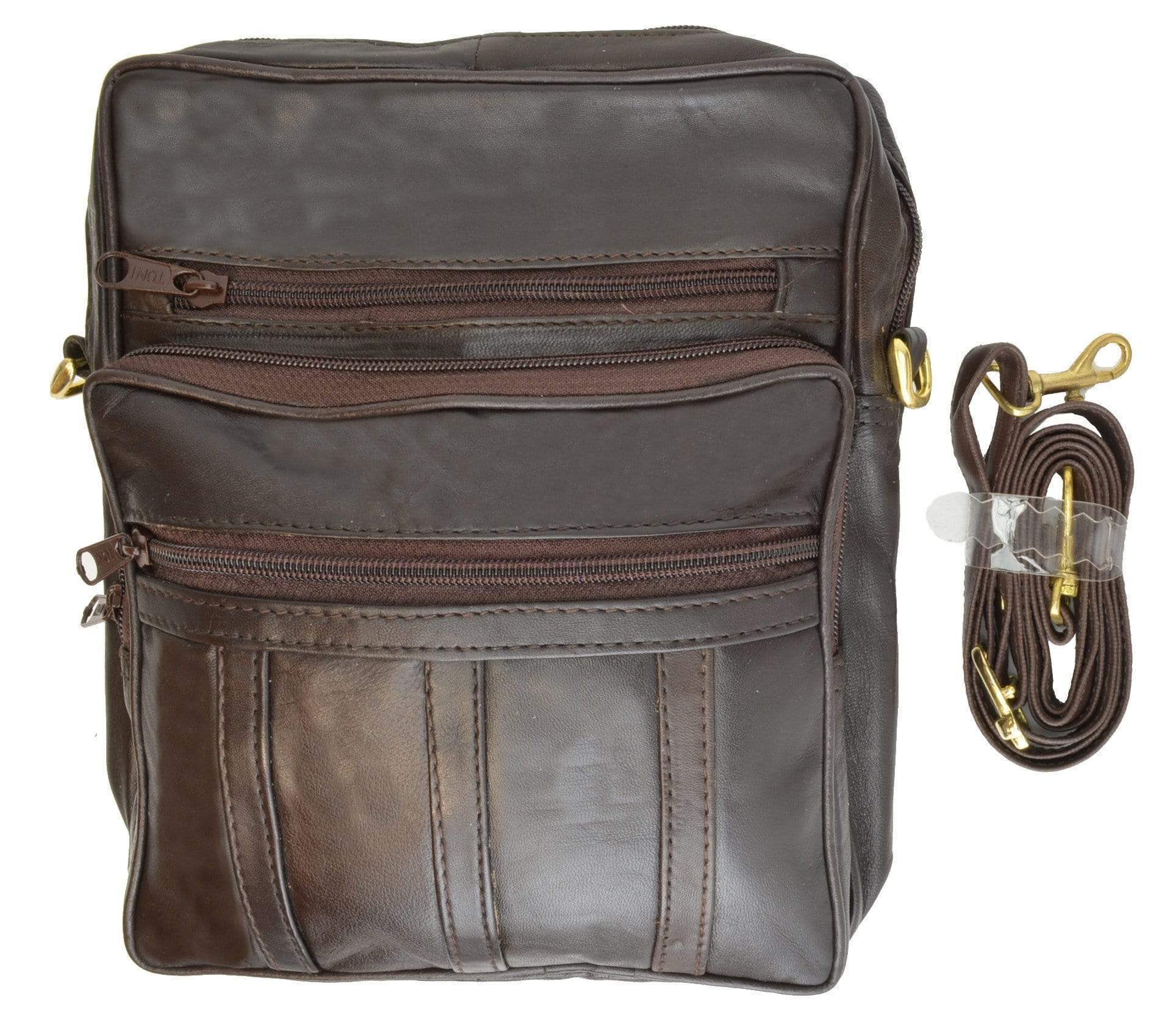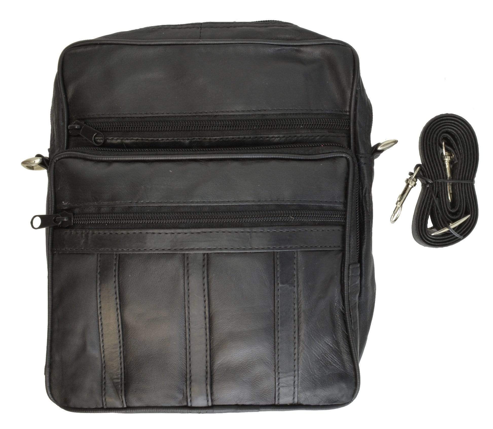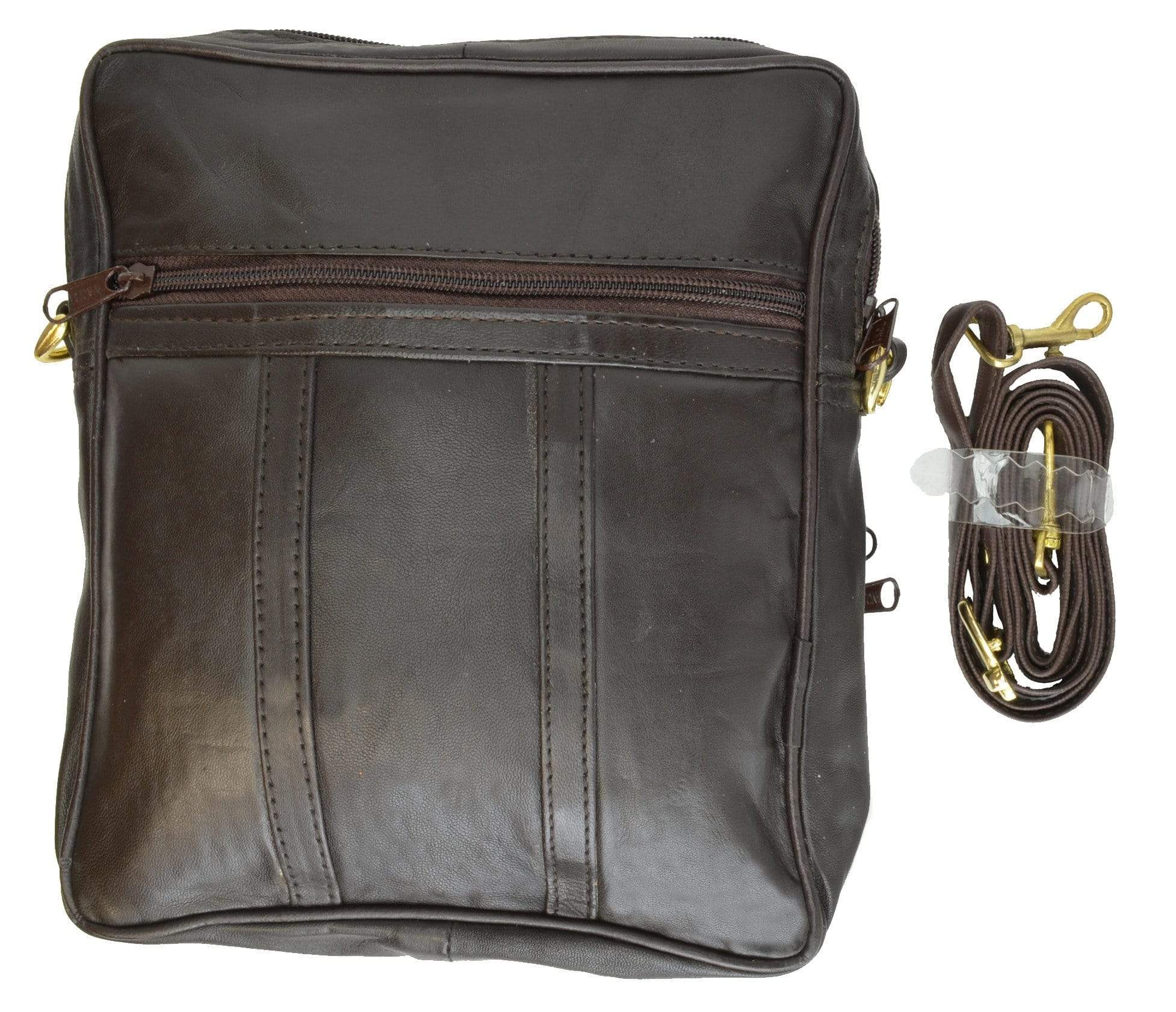 Material: Genuine LeatherSize: 7.5"; x 9.5" approxOther features: Five zippered pockets; Attachable strap