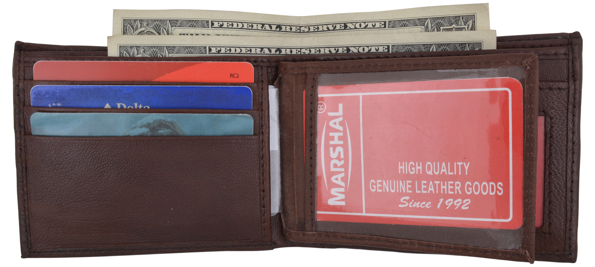 Material: Genuine Leather Tri-fold Credit Card Slots: 8+ I.D. Window: Yes Currency Pocket: Divider; Hideaway...