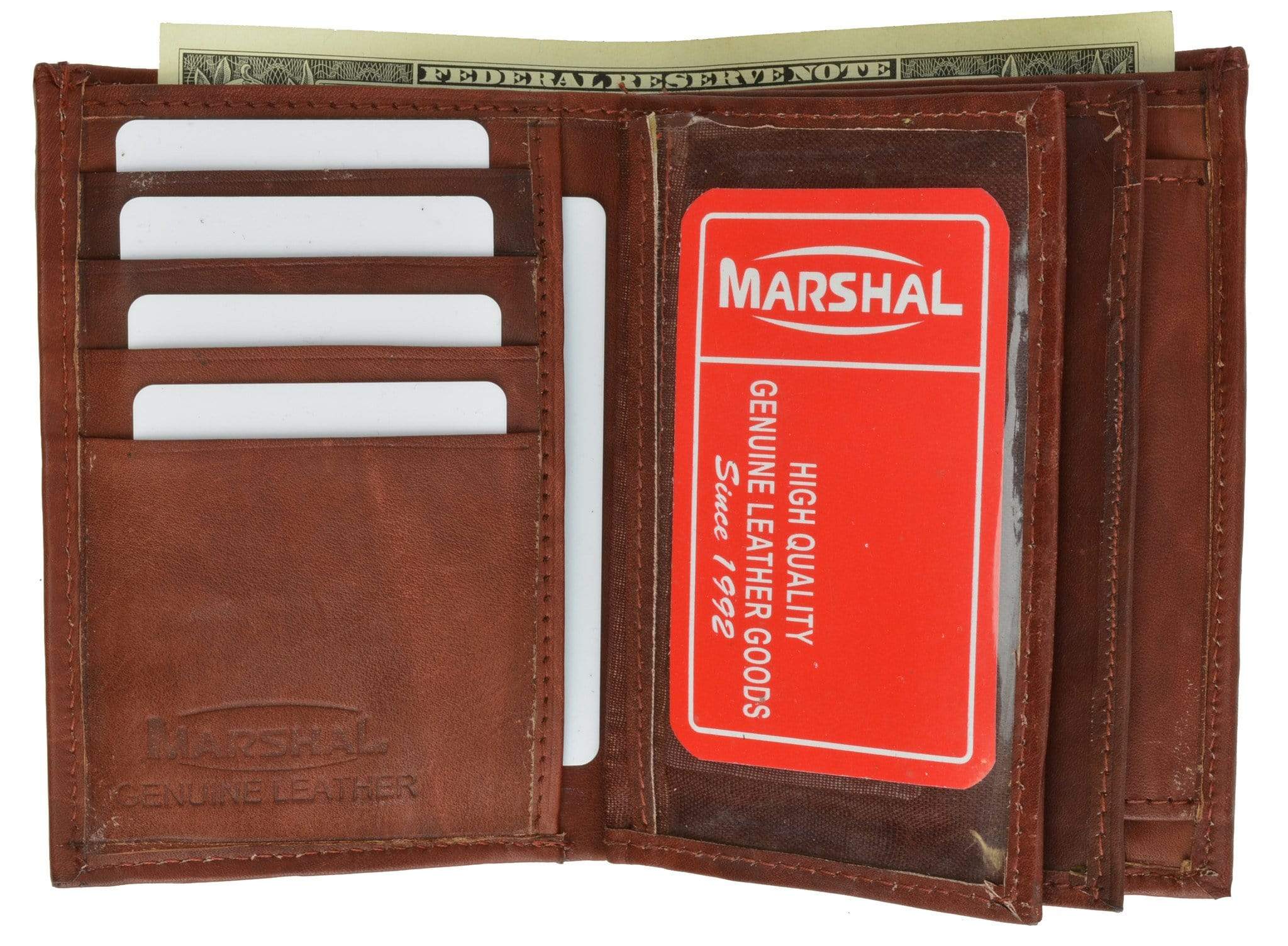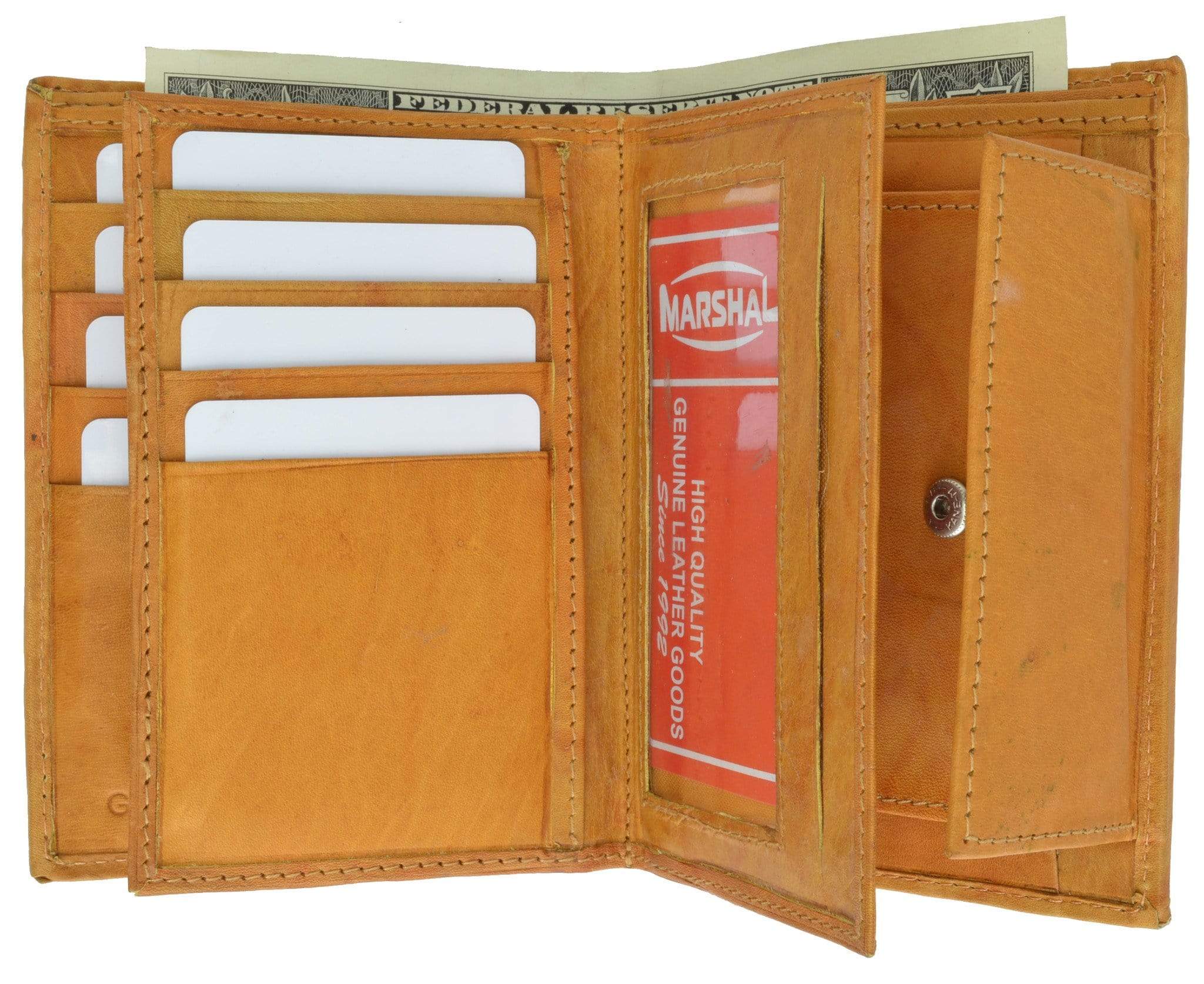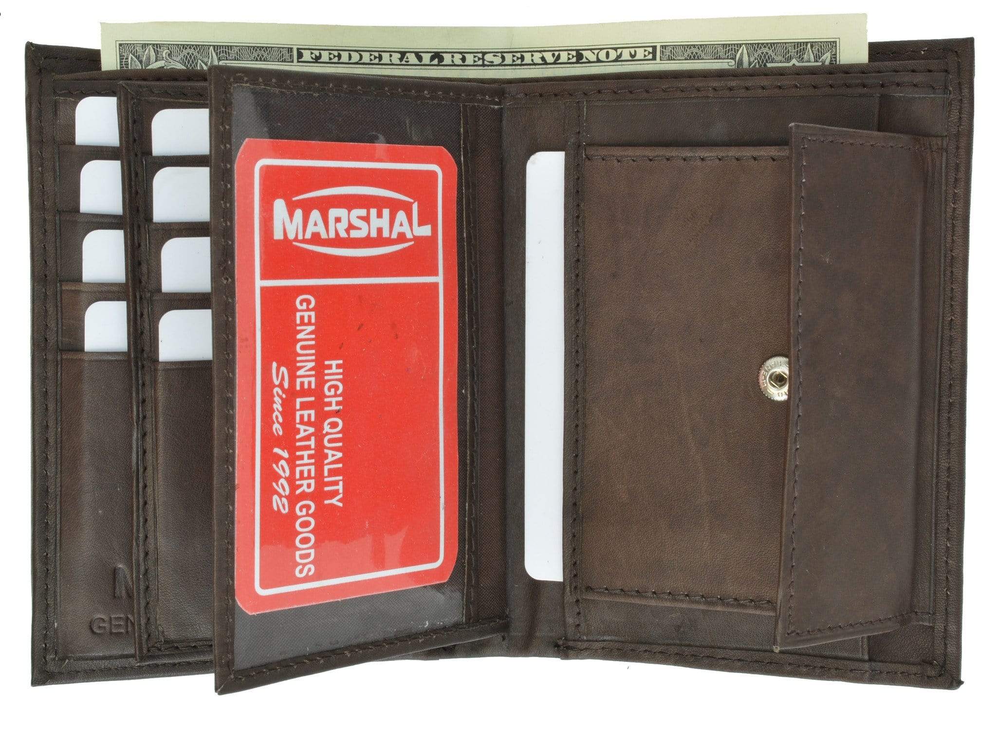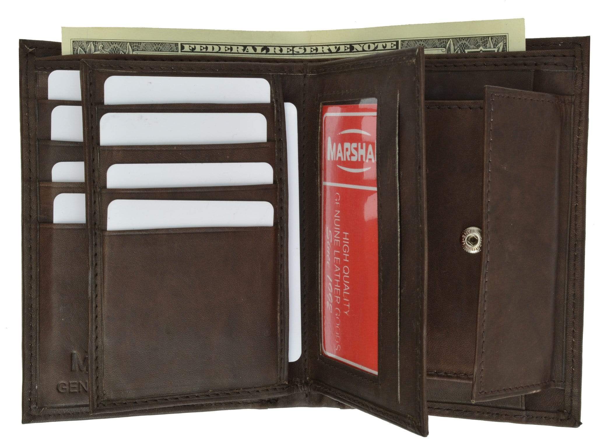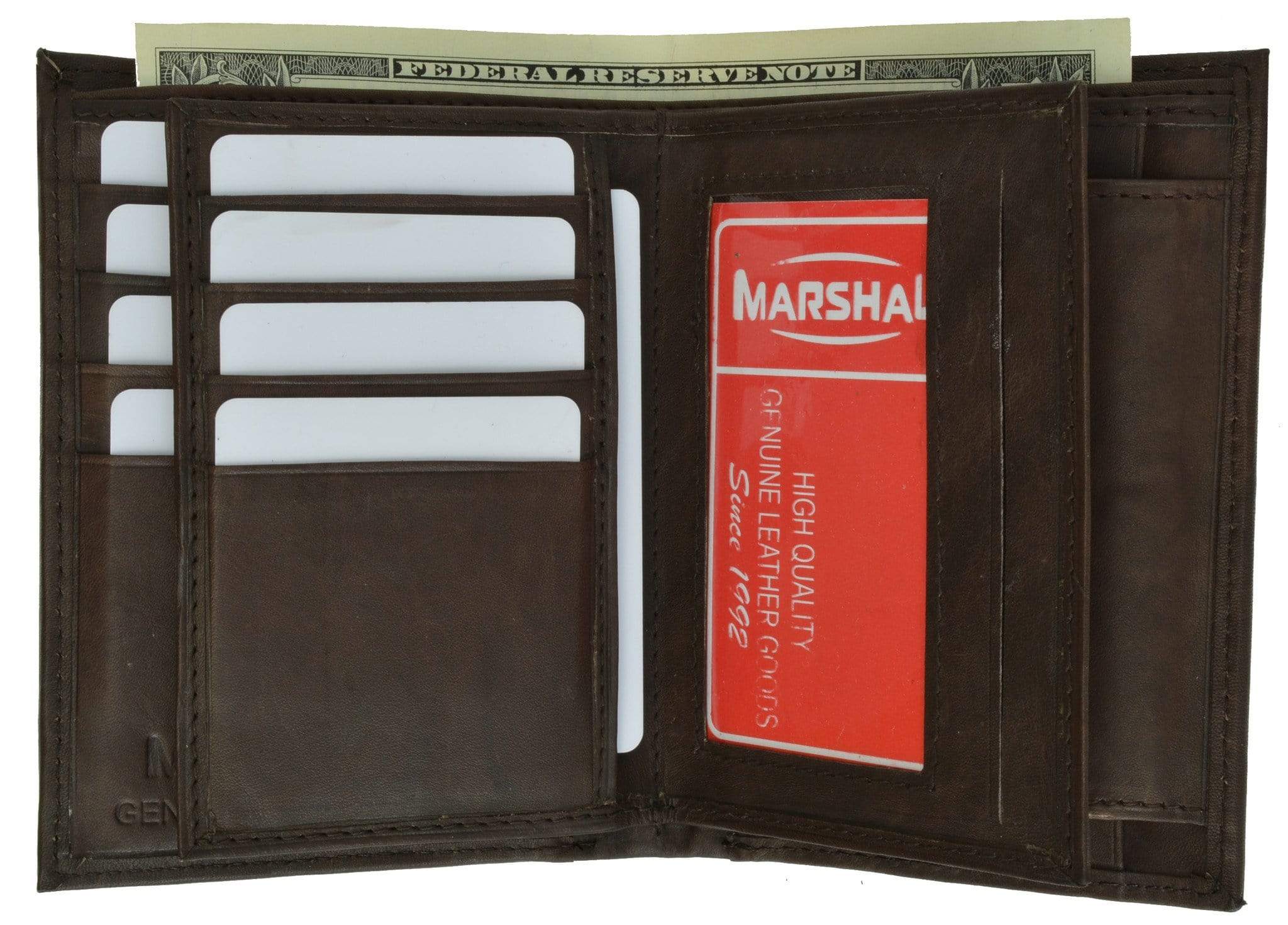 Material: Genuine Leather Tri-fold Credit Card Slots: 8+ I.D. Window: Yes Currency Pocket: Divider; Hideaway...