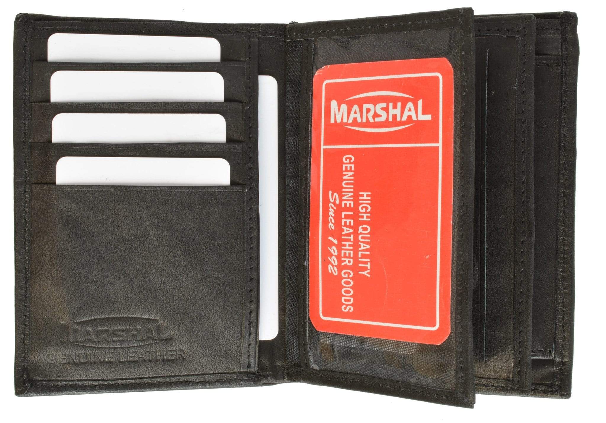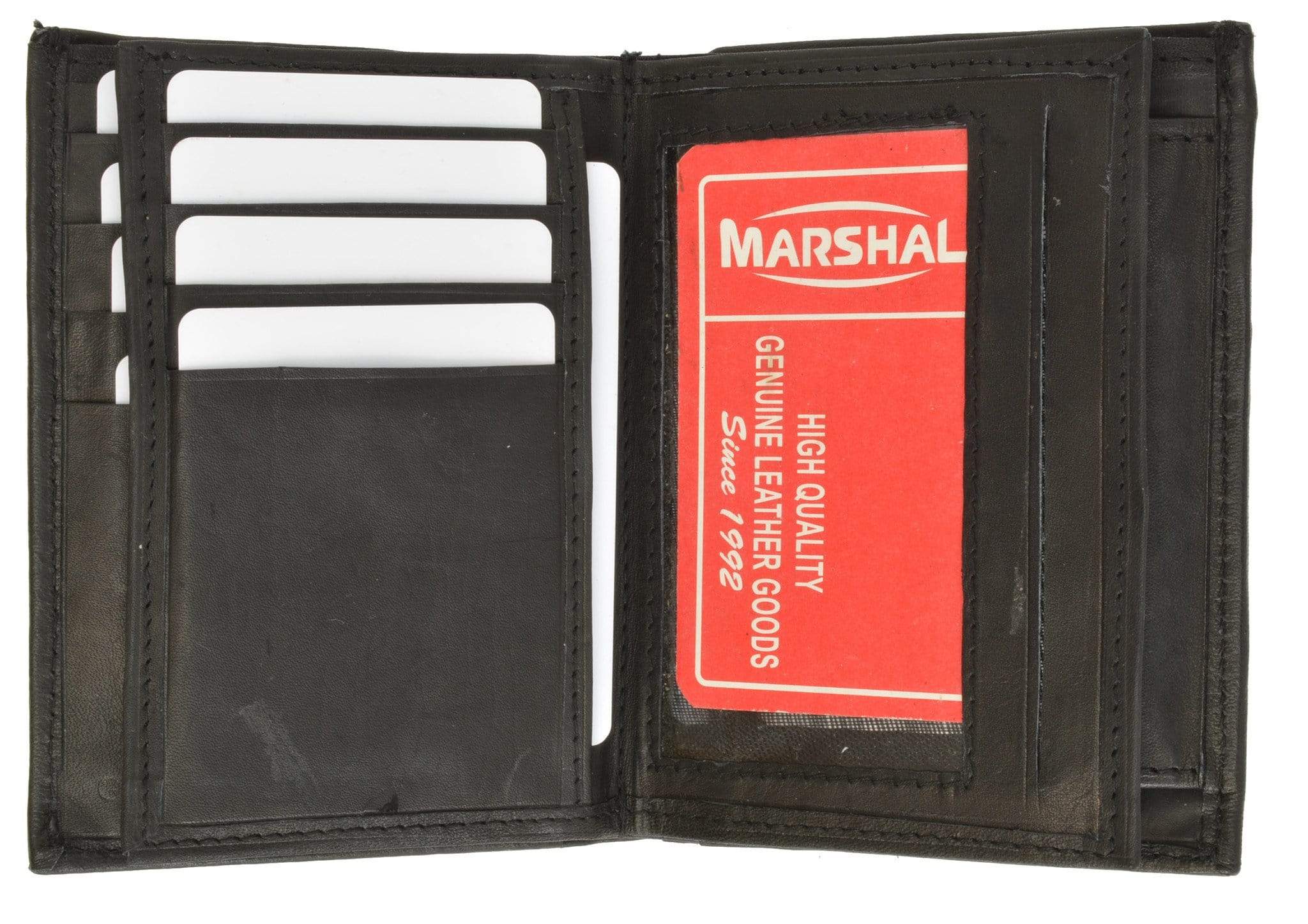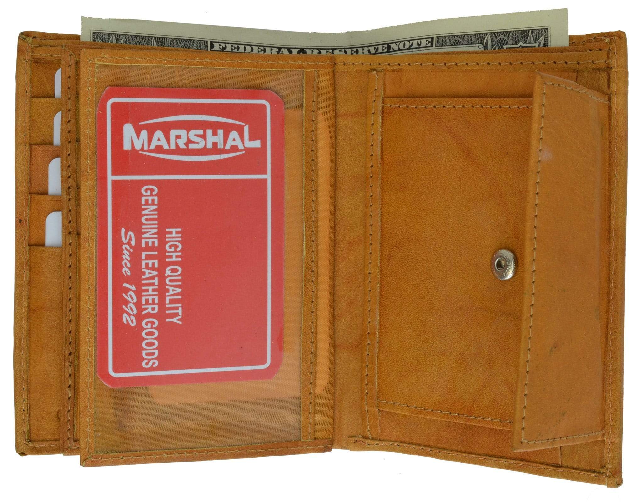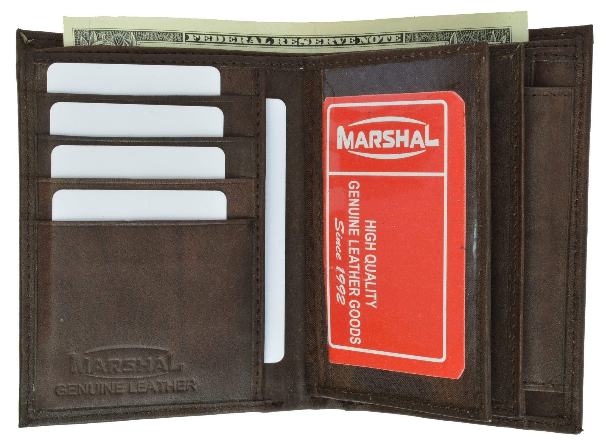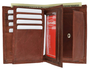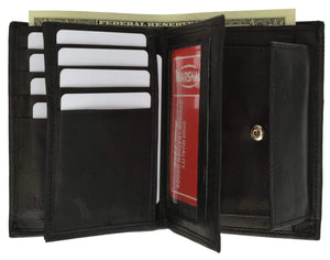 Material: Genuine Leather Tri-fold Credit Card Slots: 8+ I.D. Window: Yes Currency Pocket: Divider; Hideaway...