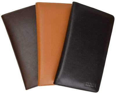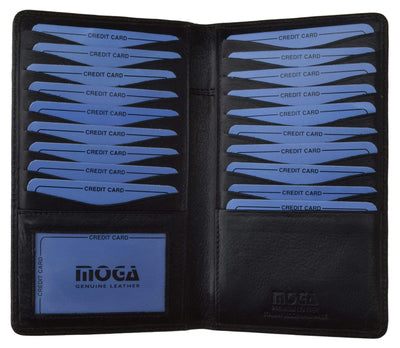 Credit card holder. Crafted of fine cowhide leather. Features 20 card slots. A mesh Id window. Two inside multipurposes pockets ideal for check books. Made from the high quality leather that the MOGA brand presents. Dimensions; Height:7", Width: 4".