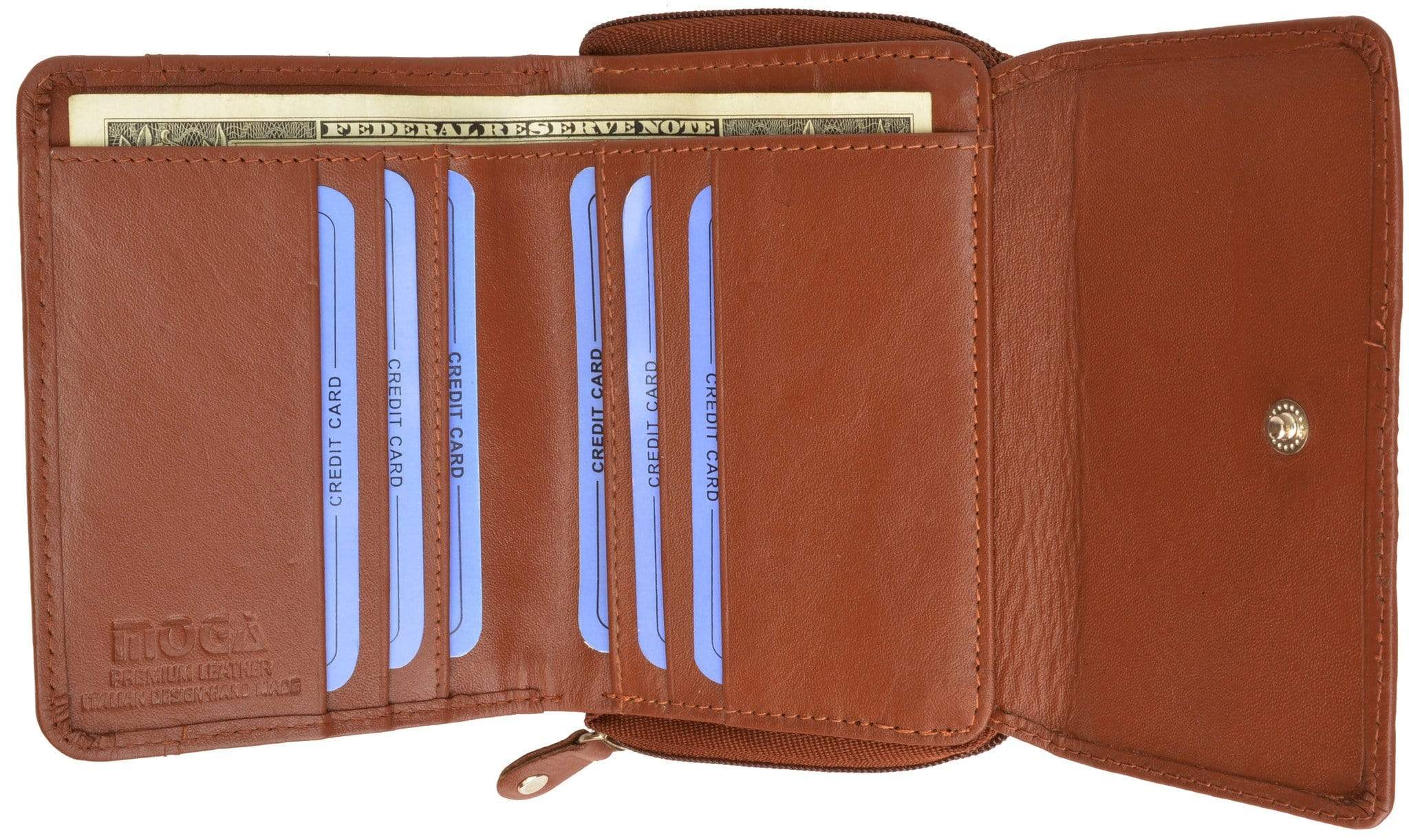 Many pockets to hold items and credit card slots. It's a trifold with an extra zippered pocket for change or other valuable items to keep. Made from MOGA's high quality leather, it is a perfect item to keep money in, in your purse. Comes in presentable gift box.