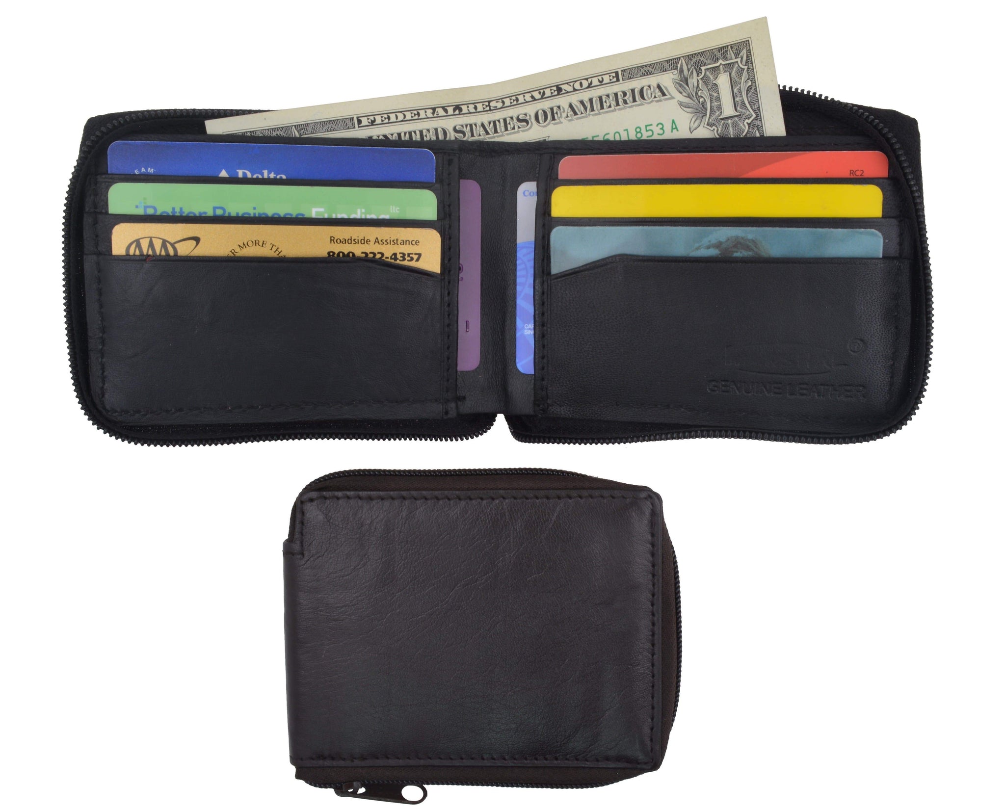 Material: Genuine Leather Tri-fold Credit Card Slots: 8+ I.D. Window: Yes Currency Pocket: Divider; Hideaway...