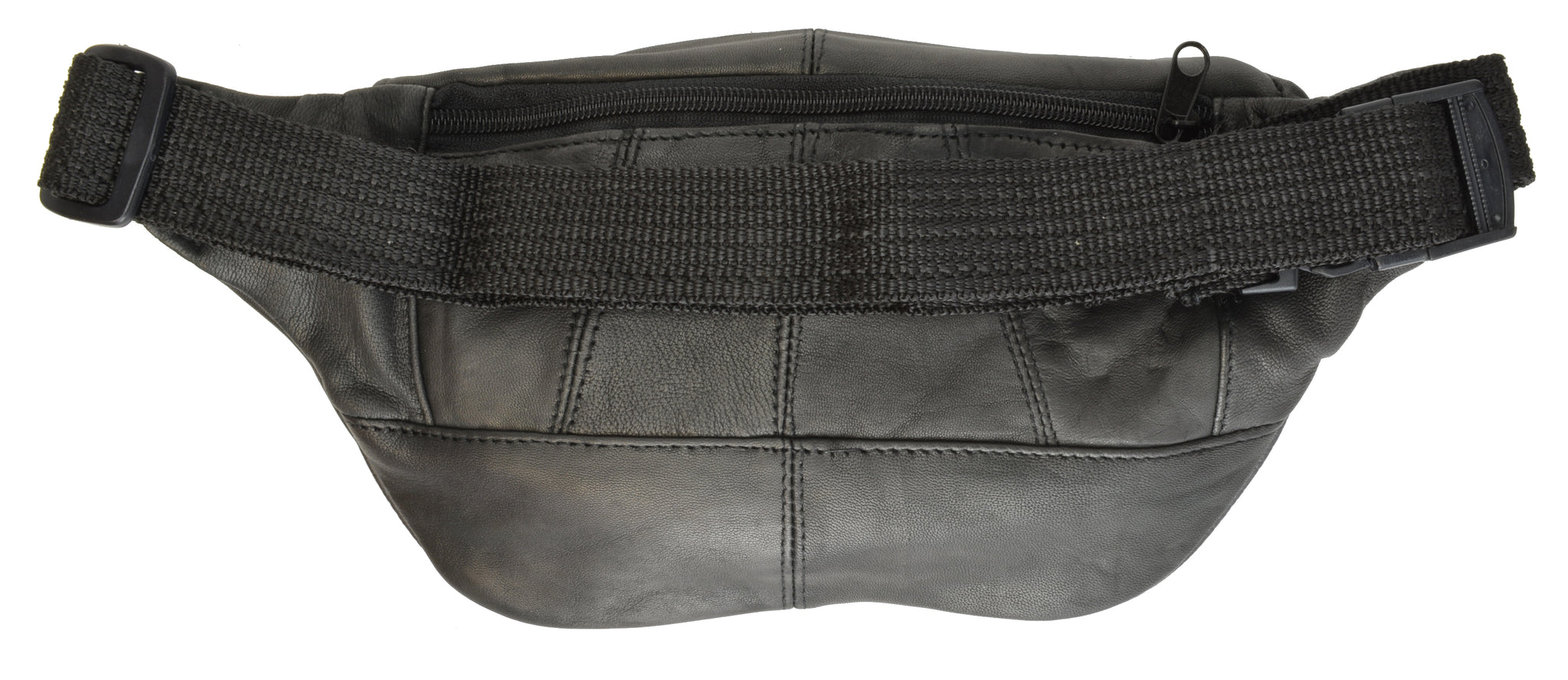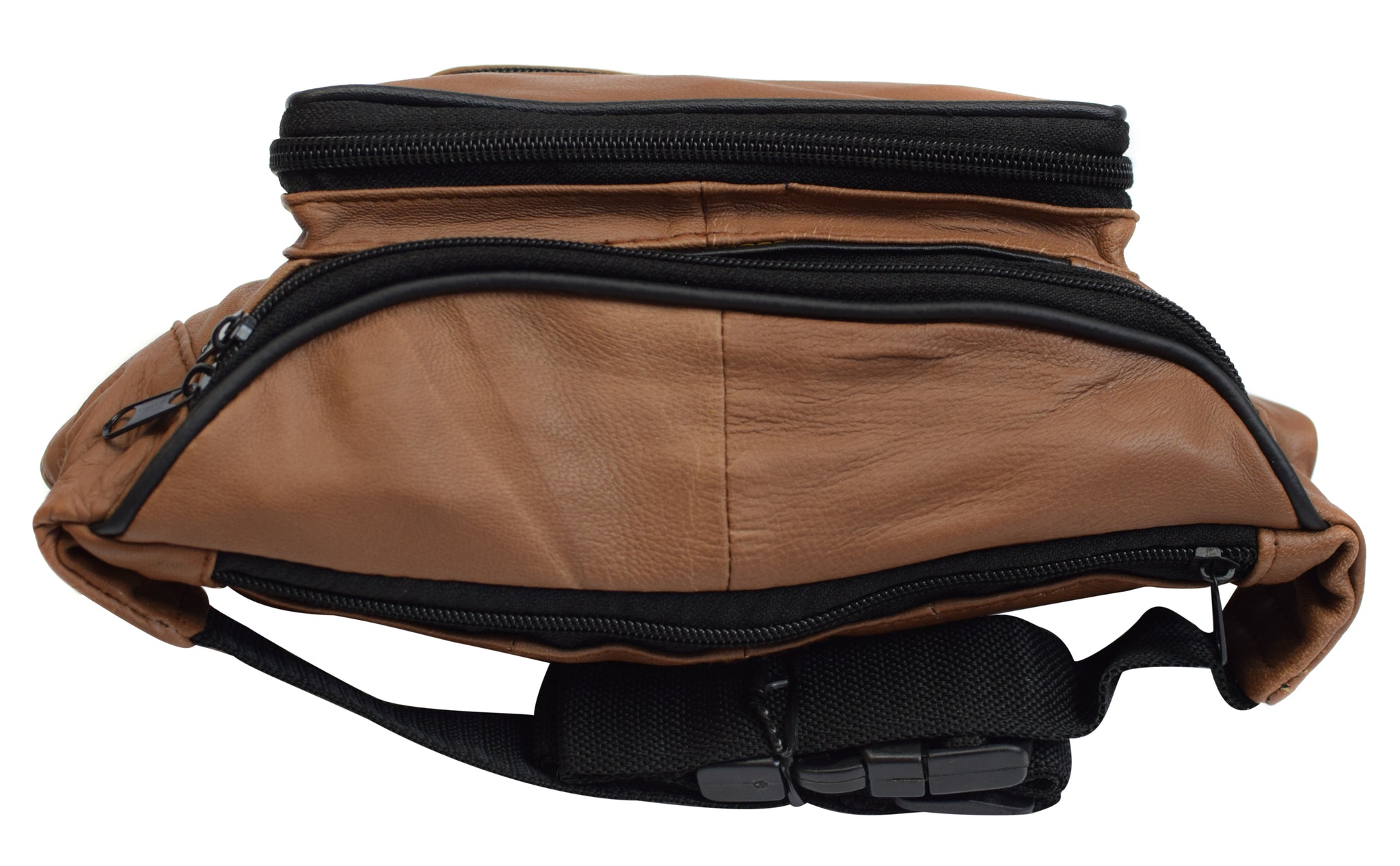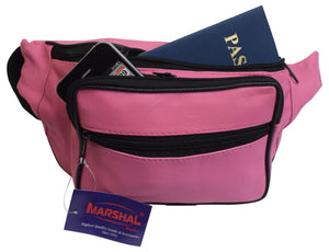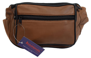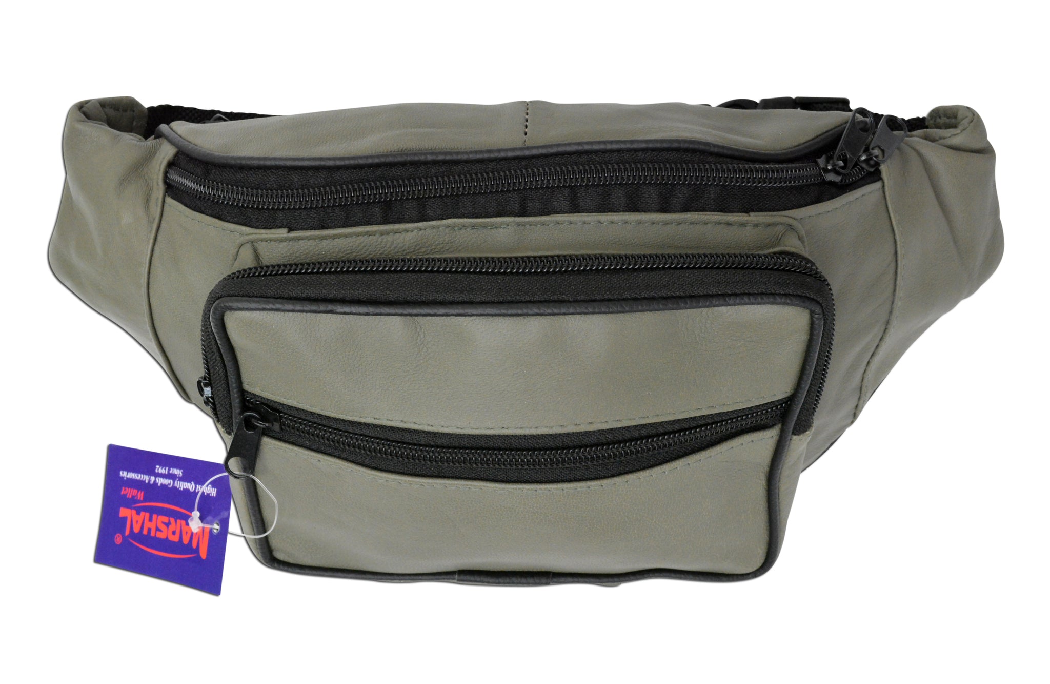 A Stylish Unisex Fanny Pack from Marshal. Quality constructed with beautiful soft Lambskin leather. It features five zippered compartments and a strong adjustable strap. Can hold cell phone, wallet and more. This is a luxurious fanny pack that will last a long time & back side has an wide zippered compartment. This has 5 zippered pockets in all, one of them in the back. The size of the zippers are 9", 7", 6", 2.1/2" & 2.1/2". It is appx. 6" tall & 13" long. It will expand to 4"-6" when fully loaded, The adjustable strap extends to app. 45" in length.