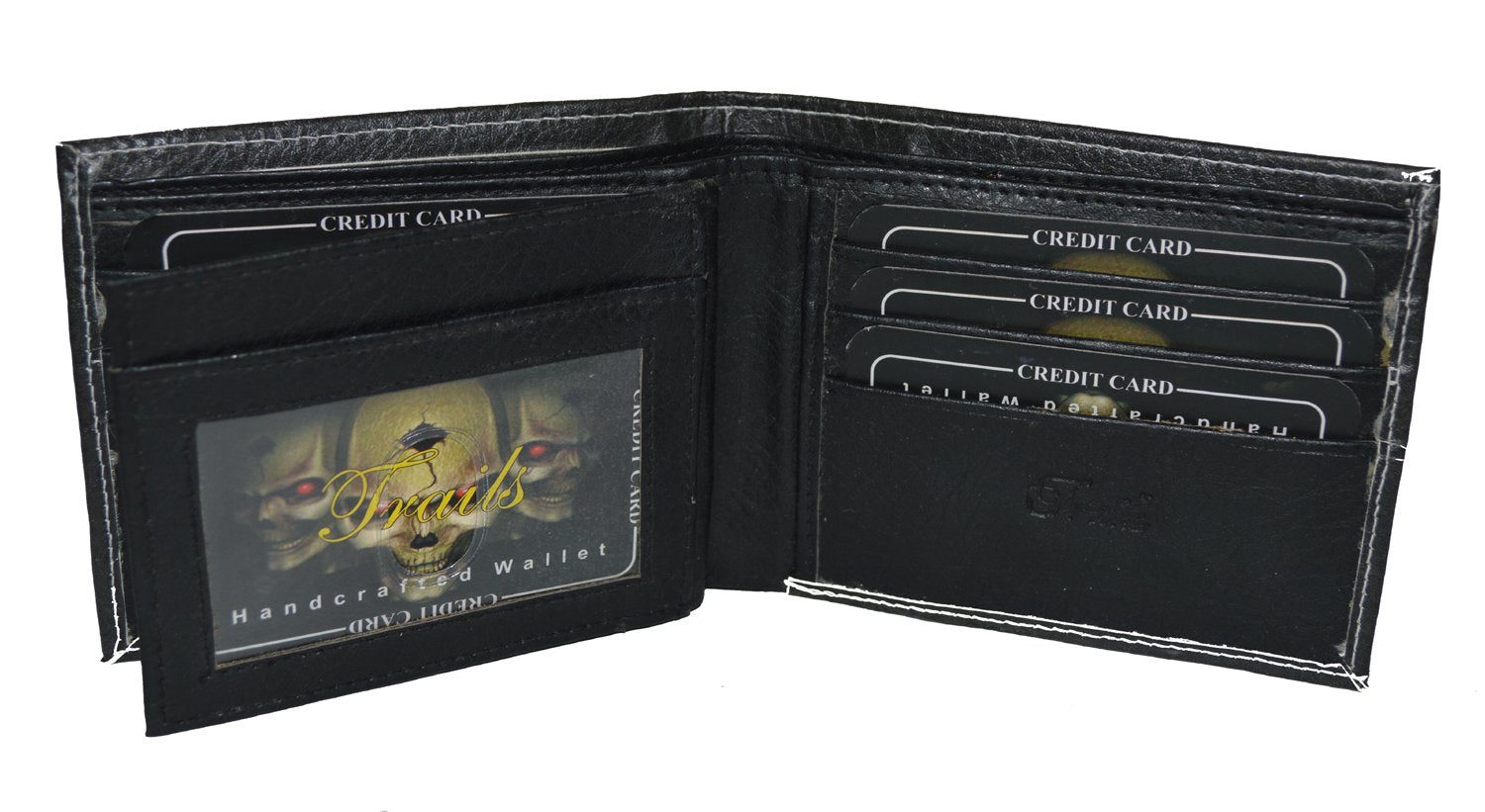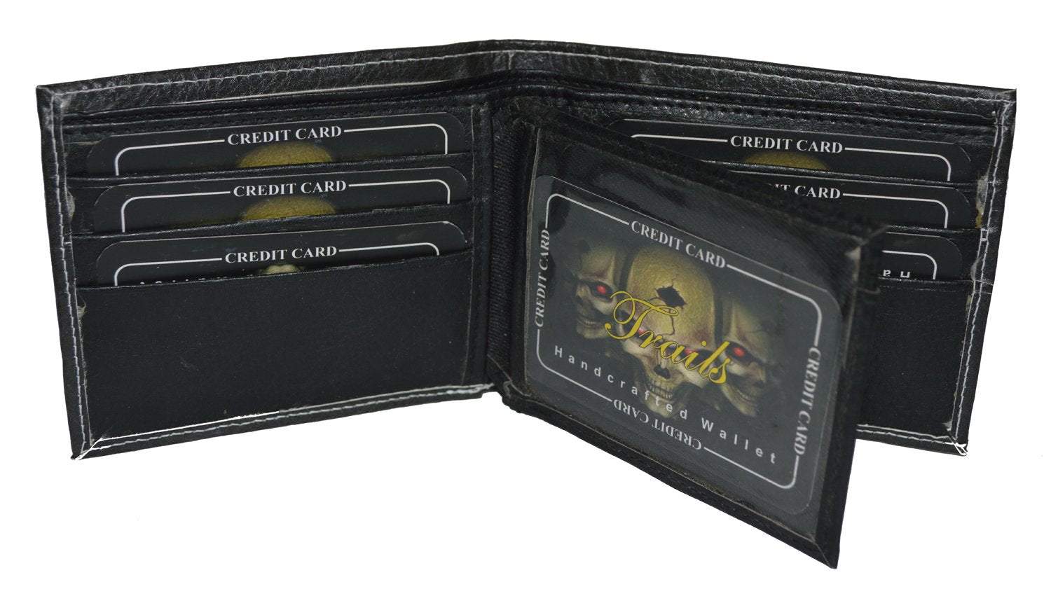 Details: It can hold 6 credit cards, 2 picture id slot, and it also has 2 money pockets behind the cards. Exotic Designer wallet : 3Skulls. It is appx. 4.5" X 3.5" when closed.