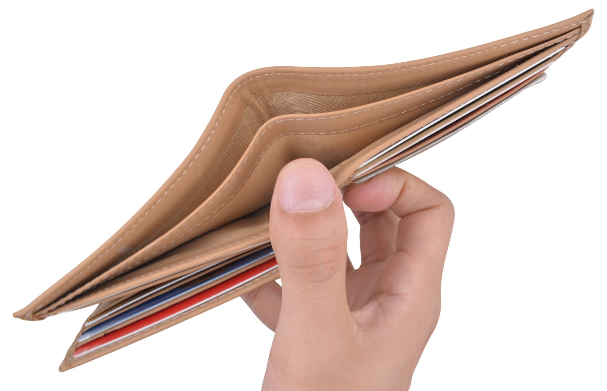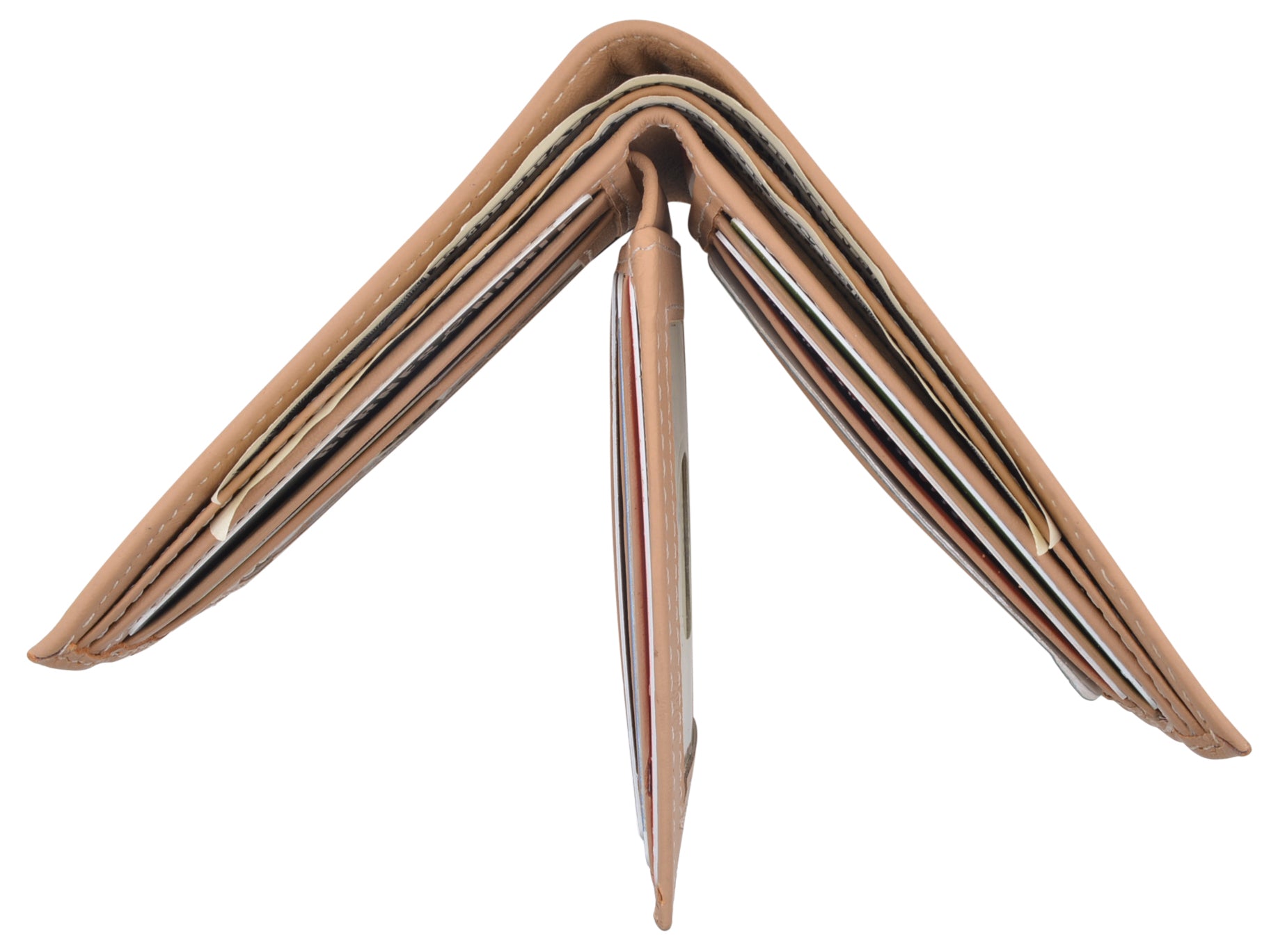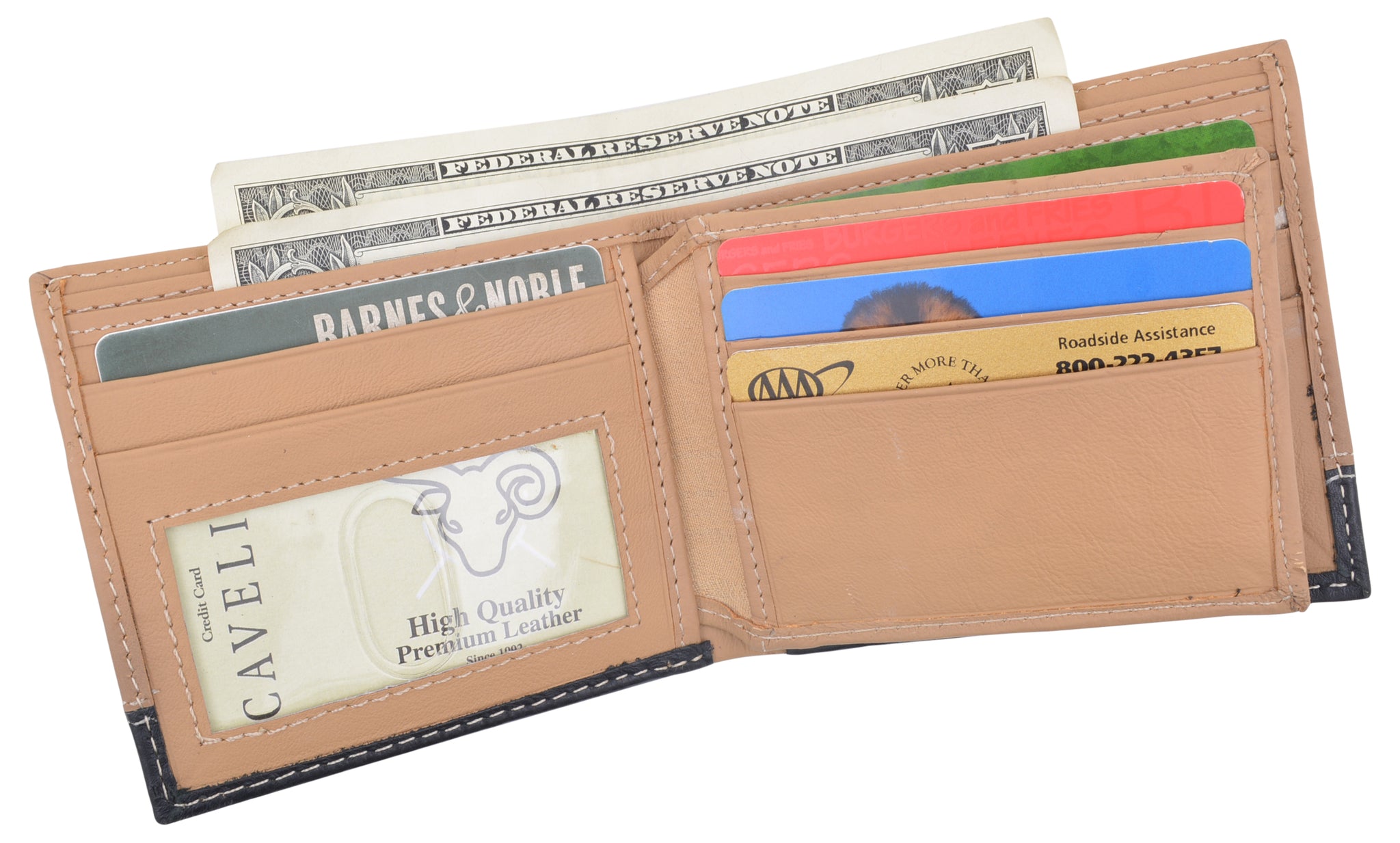 Material: Genuine Leather Tri-fold Credit Card Slots: 8+ I.D. Window: Yes Currency Pocket: Divider; Hideaway...
