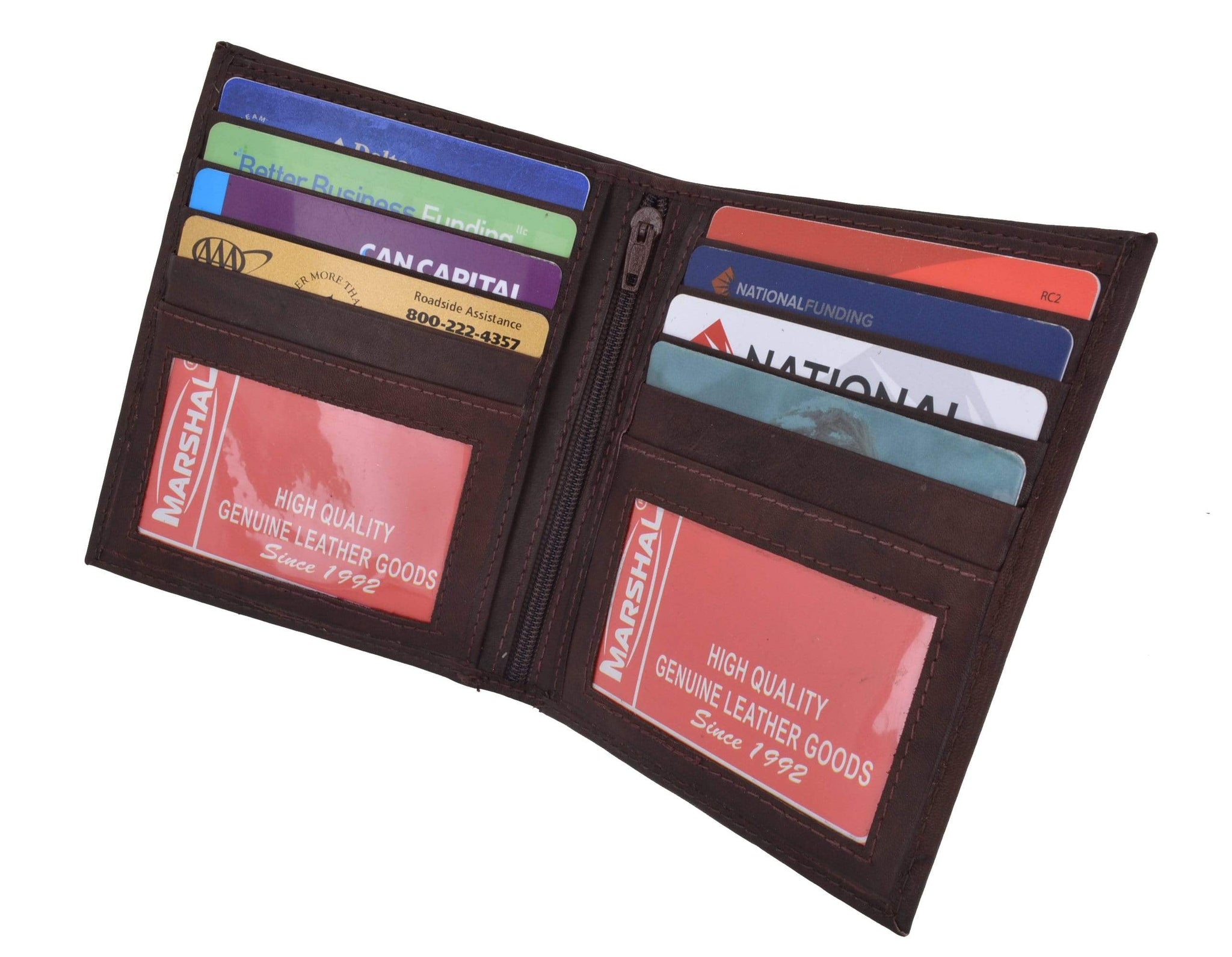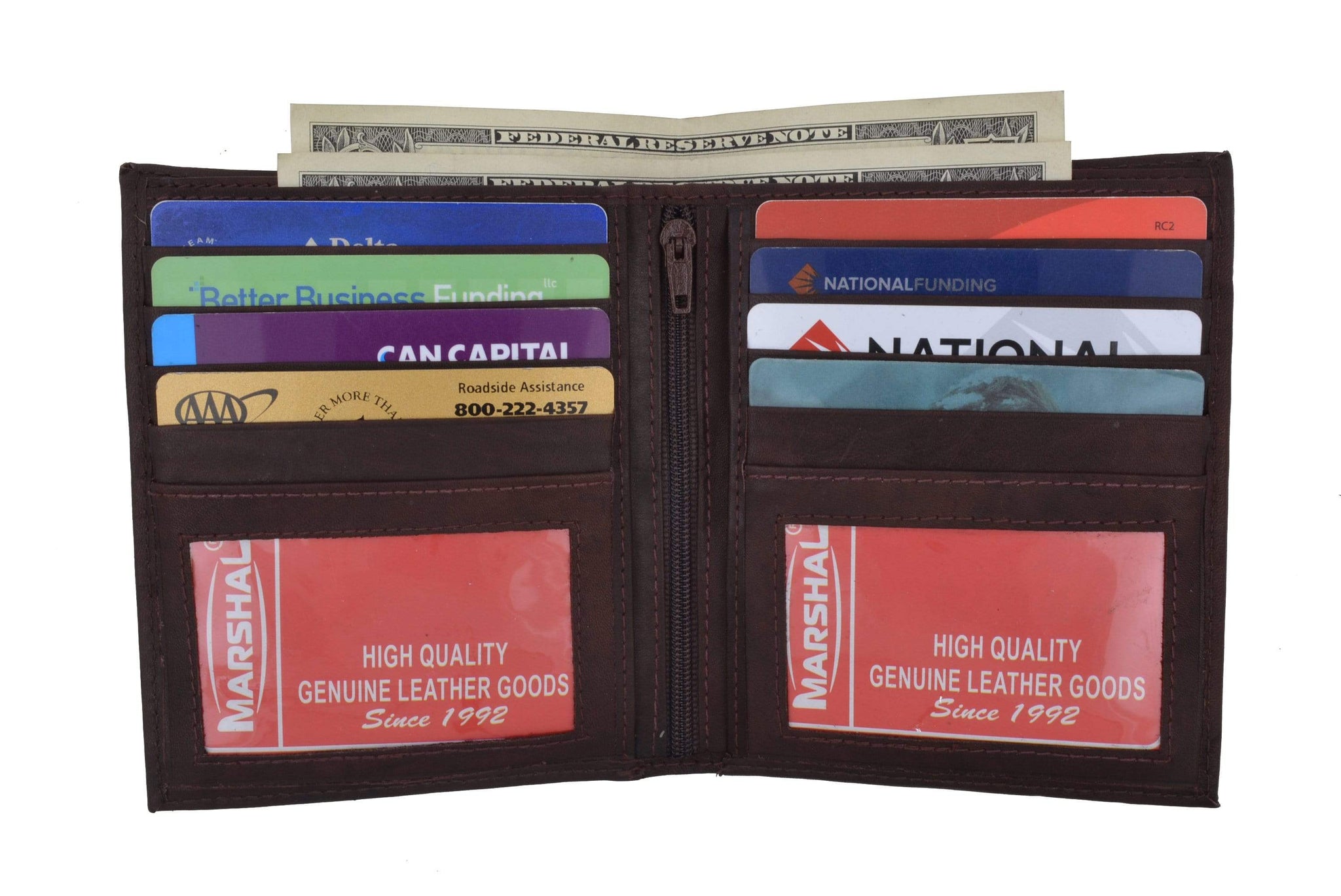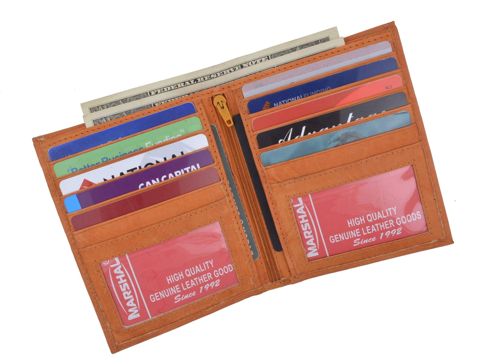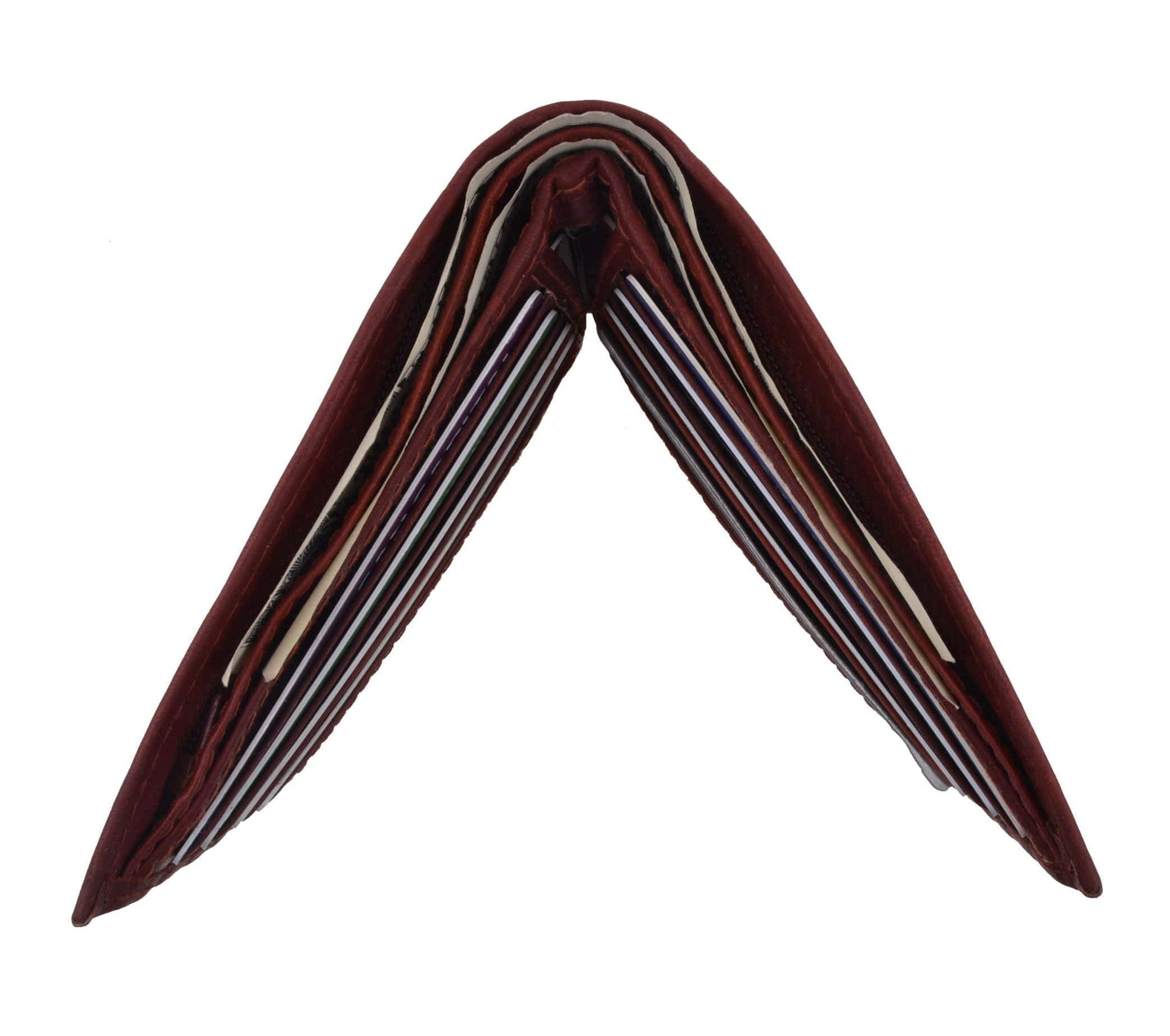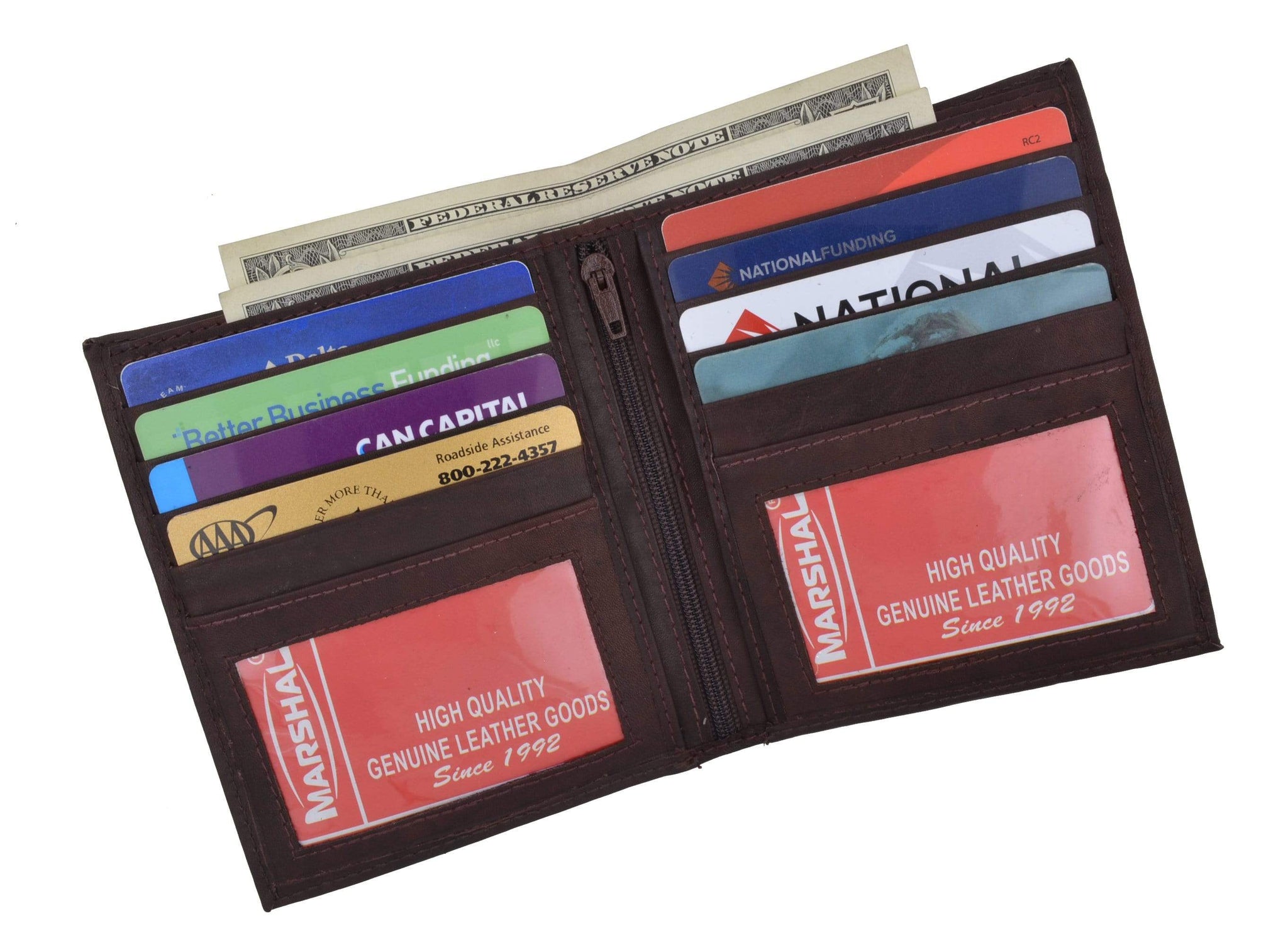 Material: Genuine Leather Tri-fold Credit Card Slots: 8+ I.D. Window: Yes Currency Pocket: Divider; Hideaway...