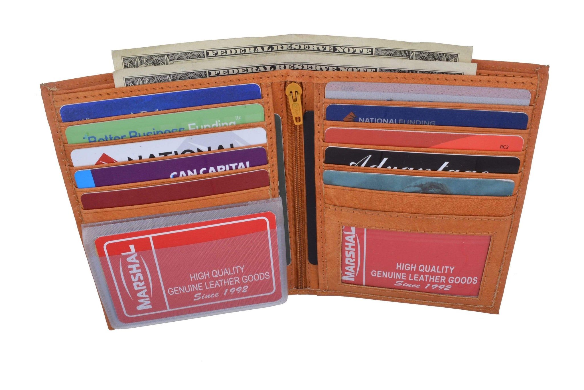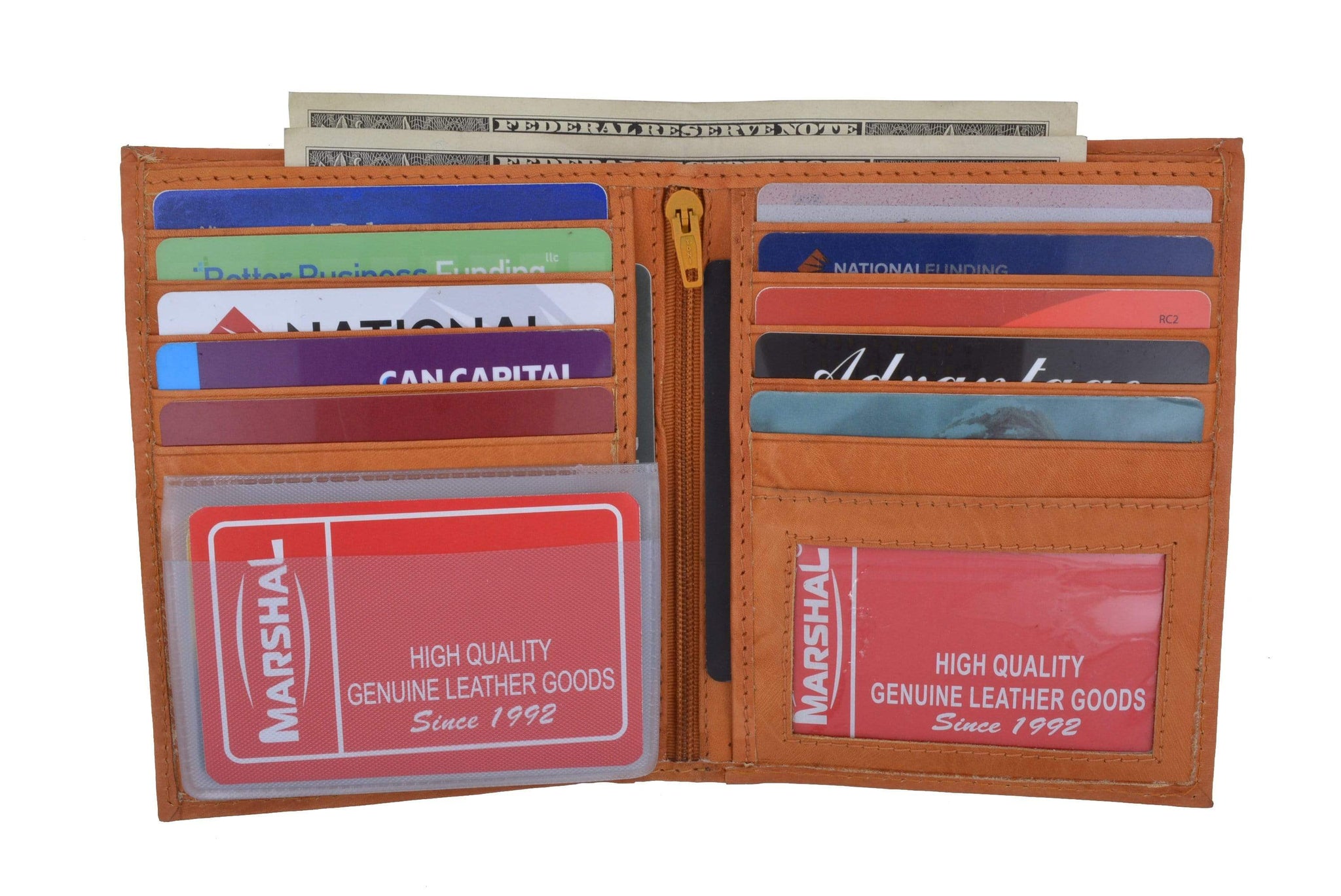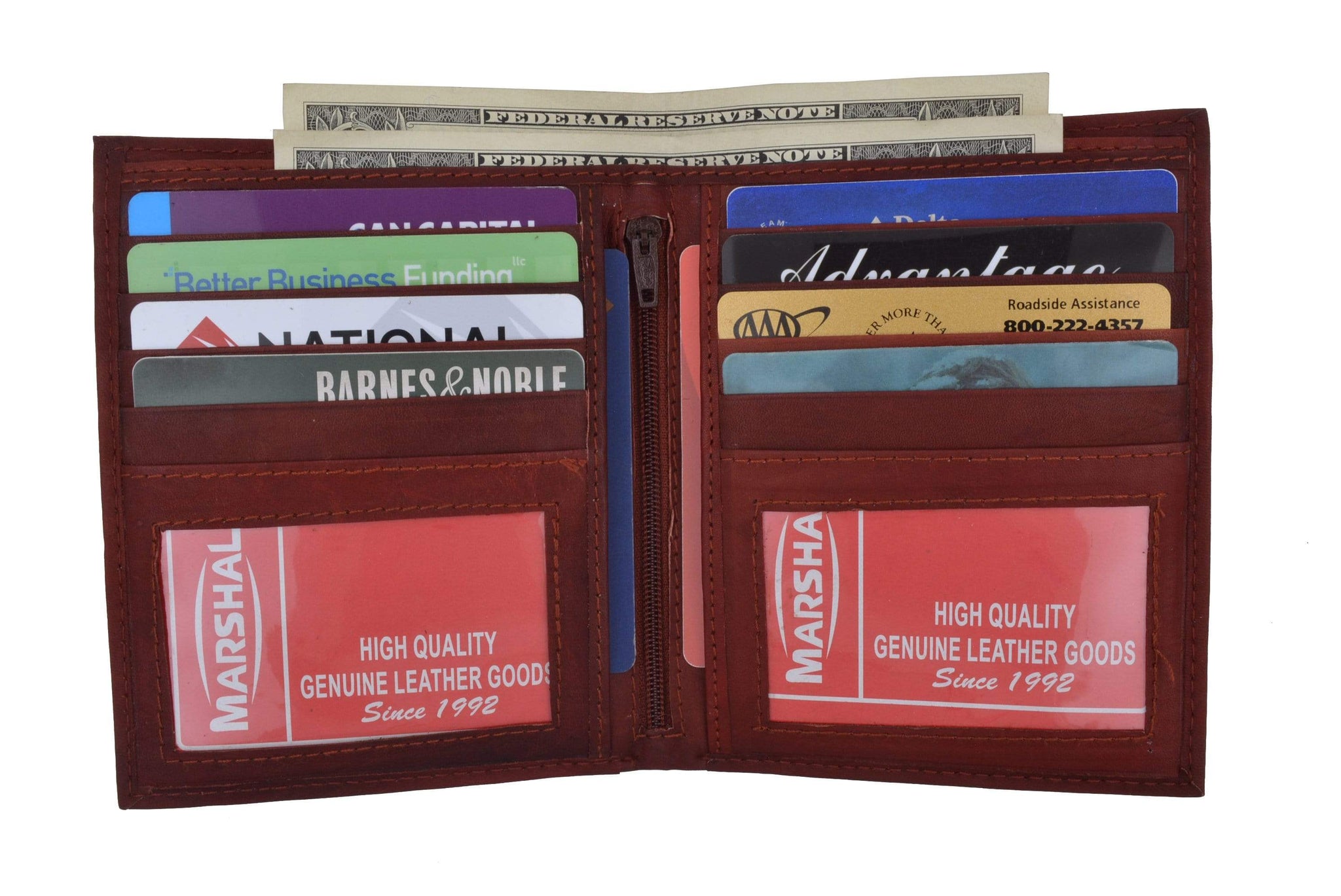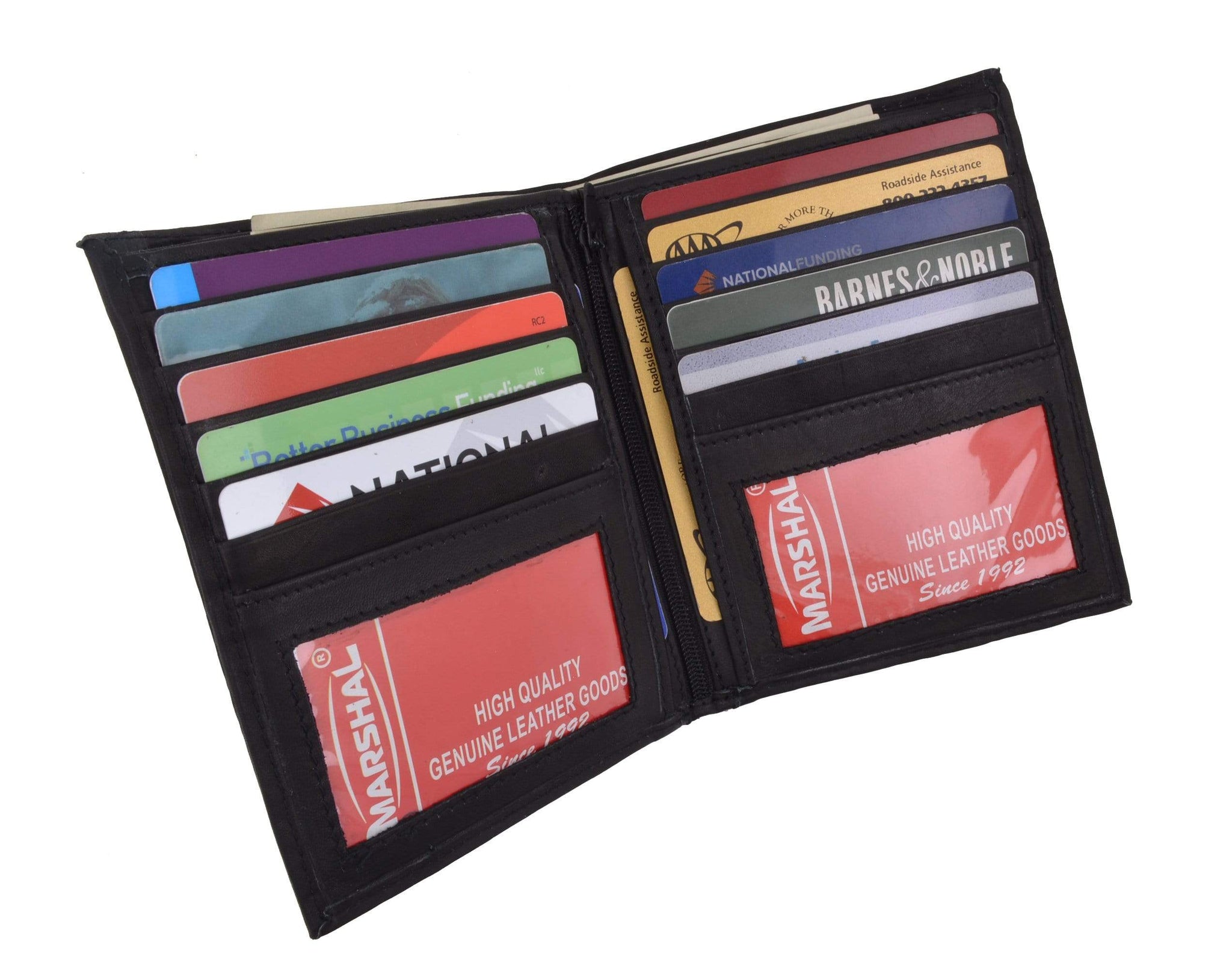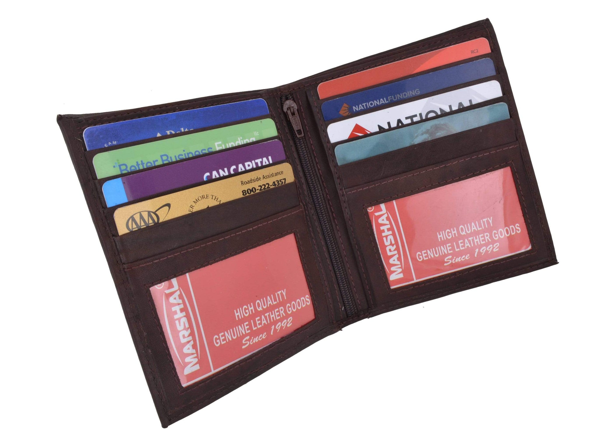 Material: Genuine Leather Tri-fold Credit Card Slots: 8+ I.D. Window: Yes Currency Pocket: Divider; Hideaway...