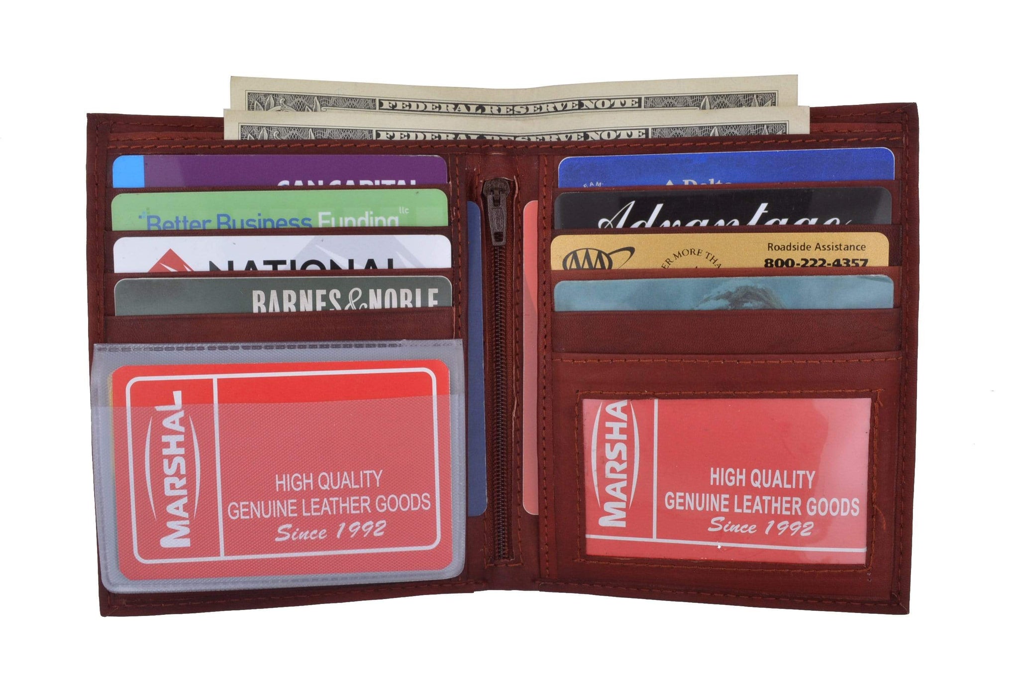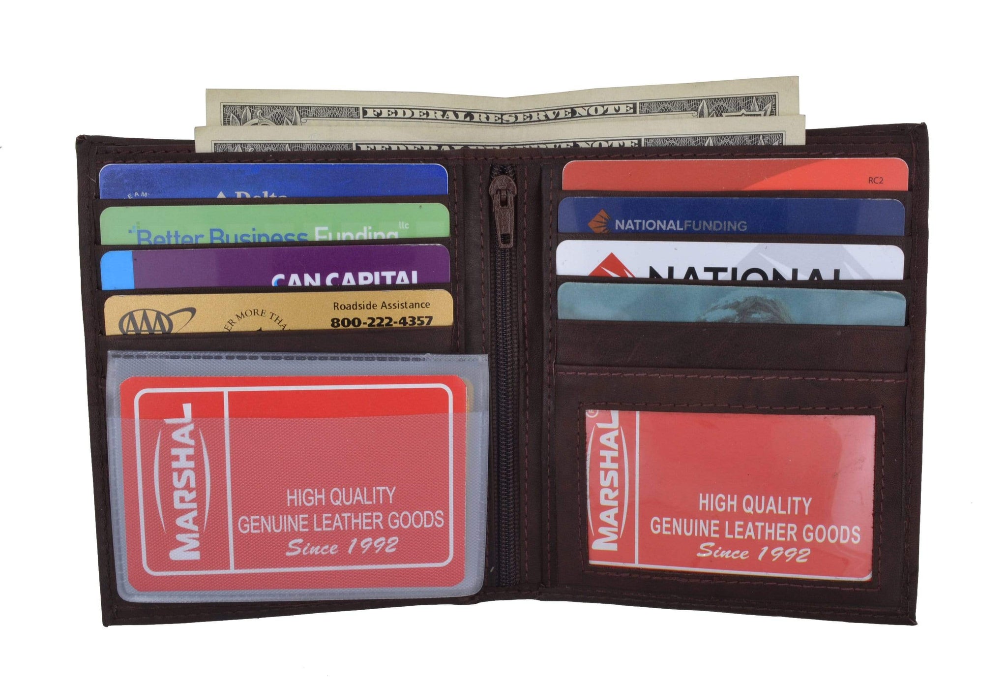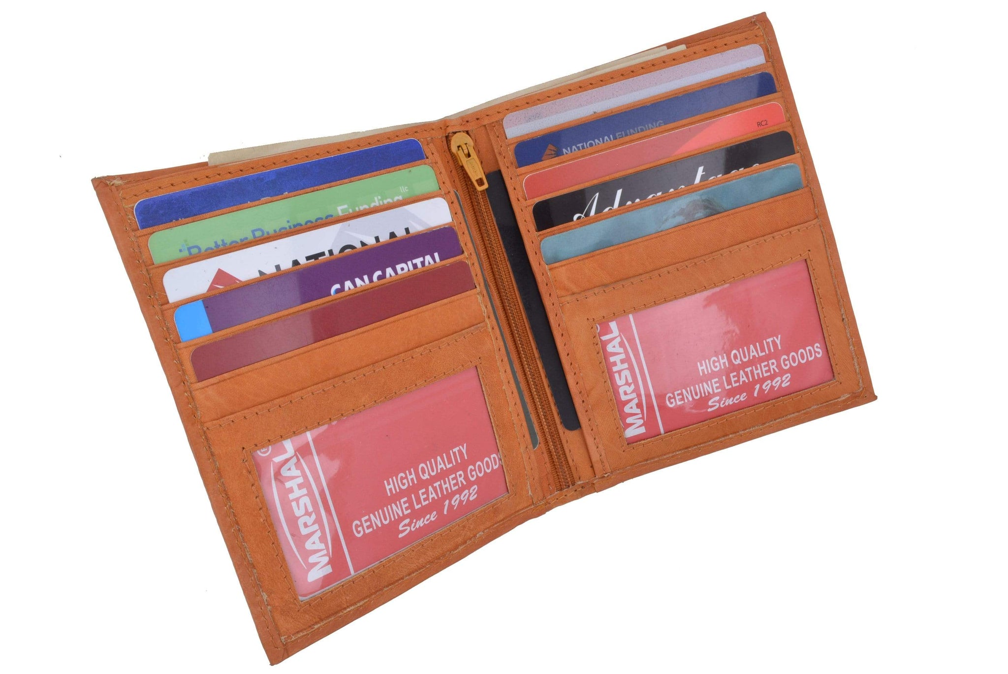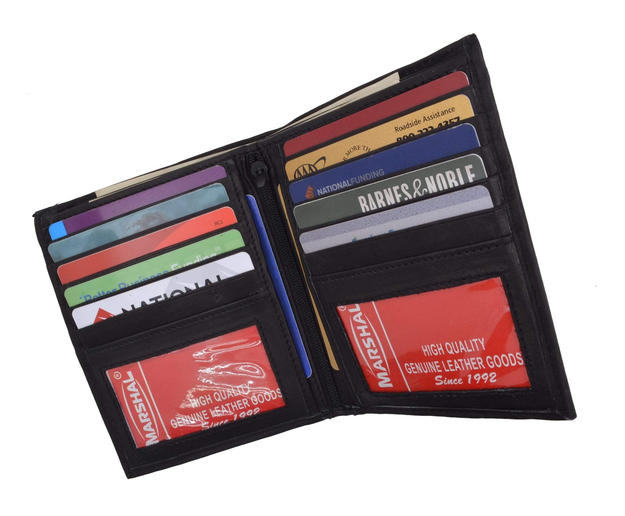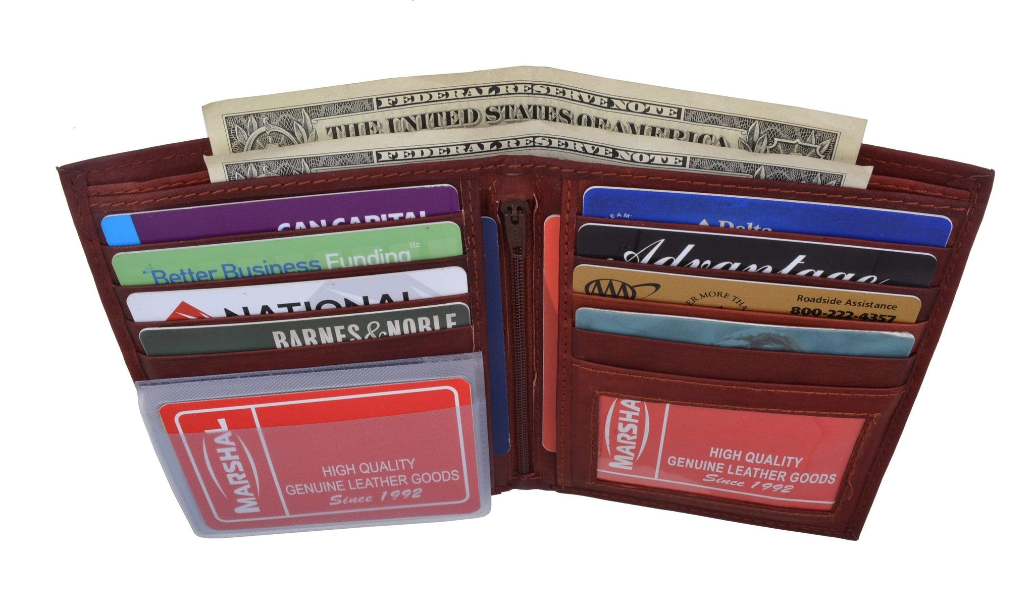 Material: Genuine Leather Tri-fold Credit Card Slots: 8+ I.D. Window: Yes Currency Pocket: Divider; Hideaway...