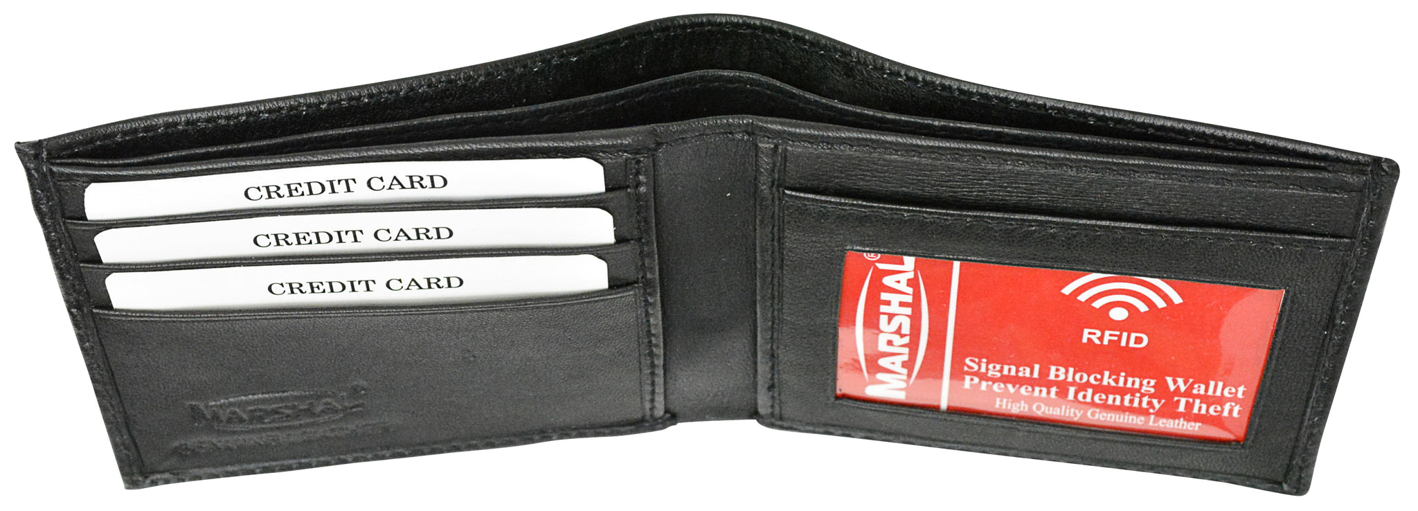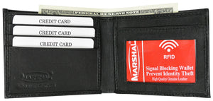 Marshal's mens soft lambskin leather slim bi-fold wallet. RFID signal blocking lining helps prevent transmission of your personal credit card information when wallet is closed. Ample room provided for your credit cards, 3 slots, 2 hidden slots and a clear ID window with a thumb hole for ease of ID removal. Packaged in a box suitable for gift giving