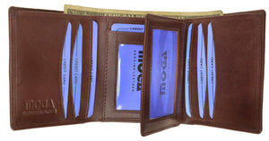 Men's wallet Trifold , crafted of fine cowhide leather, features 9 credit card slots, double Id windows, a leather currency divider, a double spare key holder. Dimensions; Height: 4", Width: 3 1/4".Center flap for extra credit cards. Vertical cards hard to fell out