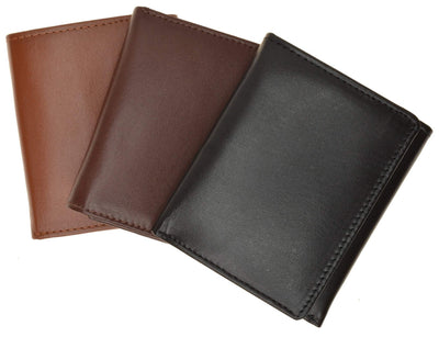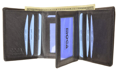 Men's wallet Trifold , crafted of fine cowhide leather, features 9 credit card slots, double Id windows, a leather currency divider, a double spare key holder. Dimensions; Height: 4", Width: 3 1/4".Center flap for extra credit cards. Vertical cards hard to fell out