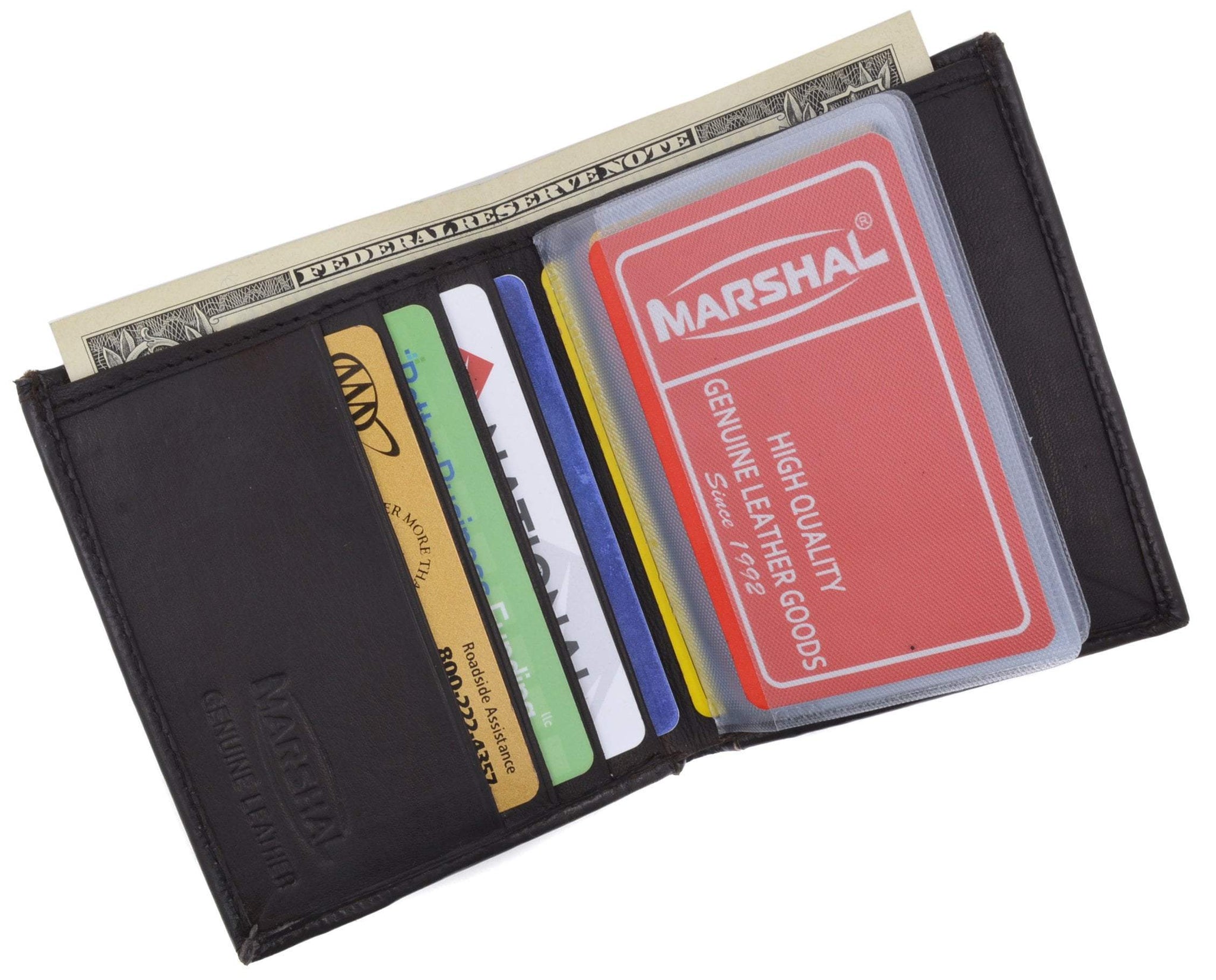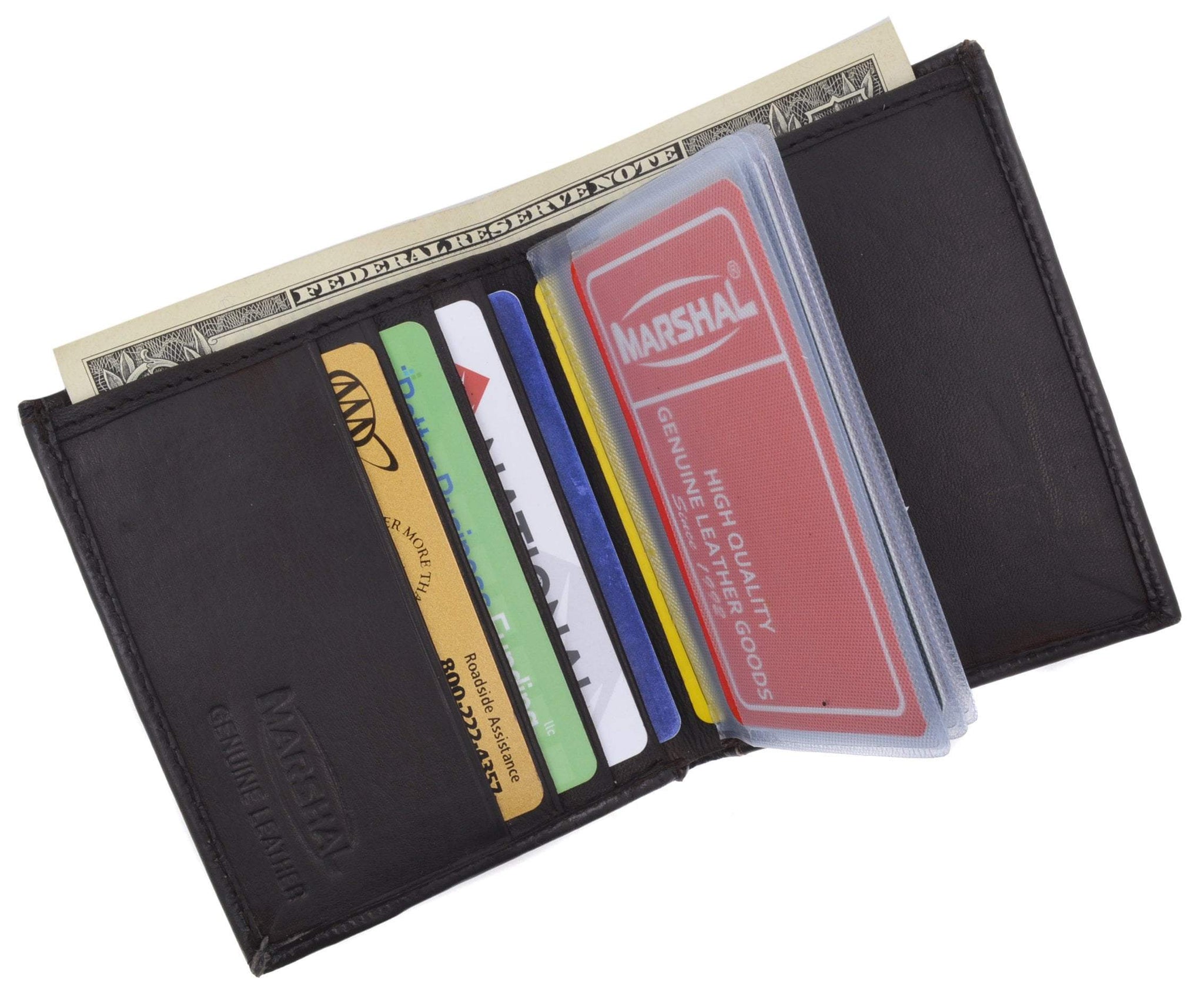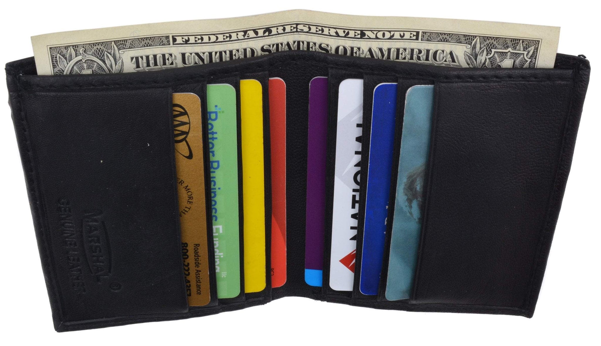 Material: Genuine Leather Tri-fold Credit Card Slots: 8+ I.D. Window: Yes Currency Pocket: Divider; Hideaway...