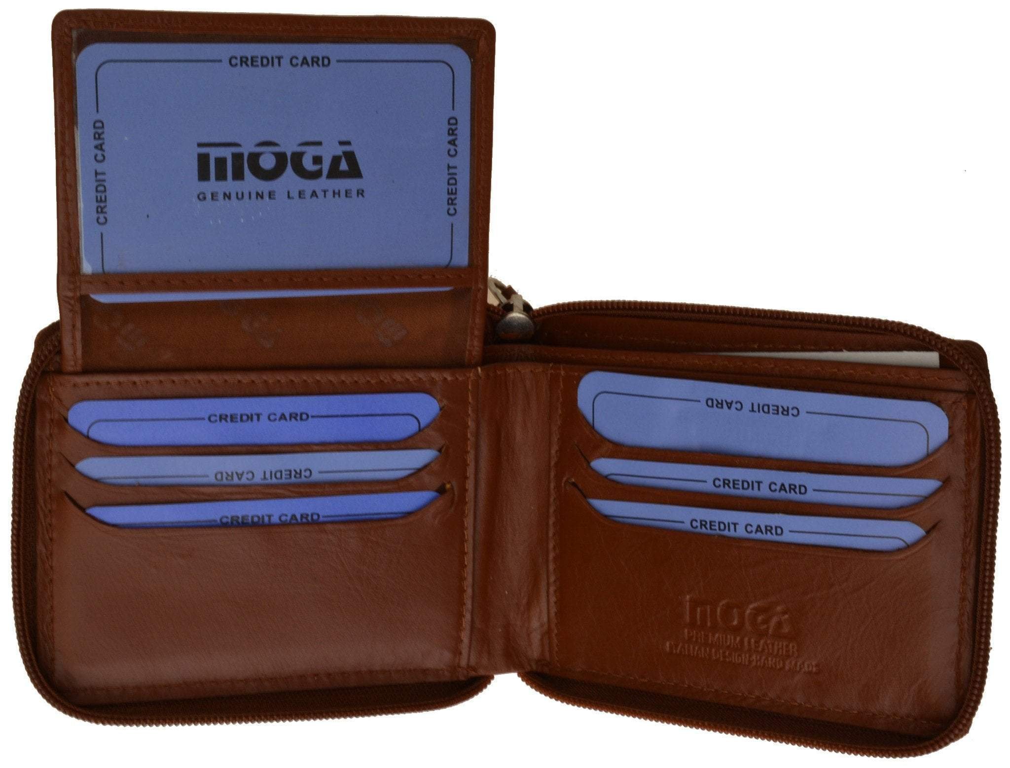 Men's wallet with zipper. This leather wallet is crafted of fine lambskin leather. Features 6 credit card slots. Two multipurposes slip pockets. Also has a flap for your I.D. and extra credit cards. A inside slip zippered pocket for currency. A zippered closure. Made from high end leather from the MOGA brand and comes in a nice gift box. Dimensions; Height:3 1/2", Width:4 1/4".
